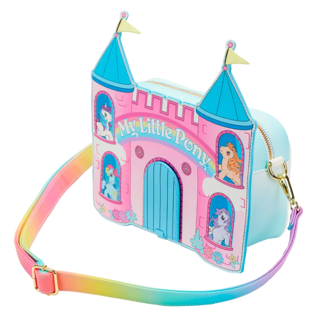 Make each day shine a bit brighter with the magic of a beloved childhood classic. The Loungefly My Little Pony® Castle Crossbody Bag is ready to dazzle your collection. This whimsical accessory portrays the Dream Castle, where Glory, Butterscotch, Sunlight, and Blossom have gathered to play. Open the functional drawbridge flap to reveal Parasol and Medley, who are eager to greet you! On the back, a bluebird flies above Skydancer, Medley, and Firefly who appear on clouds surrounded by stars and rainbows. This crossbody bag adds a dash of flair to any outfit and is the perfect addition to your My Little Pony collection.