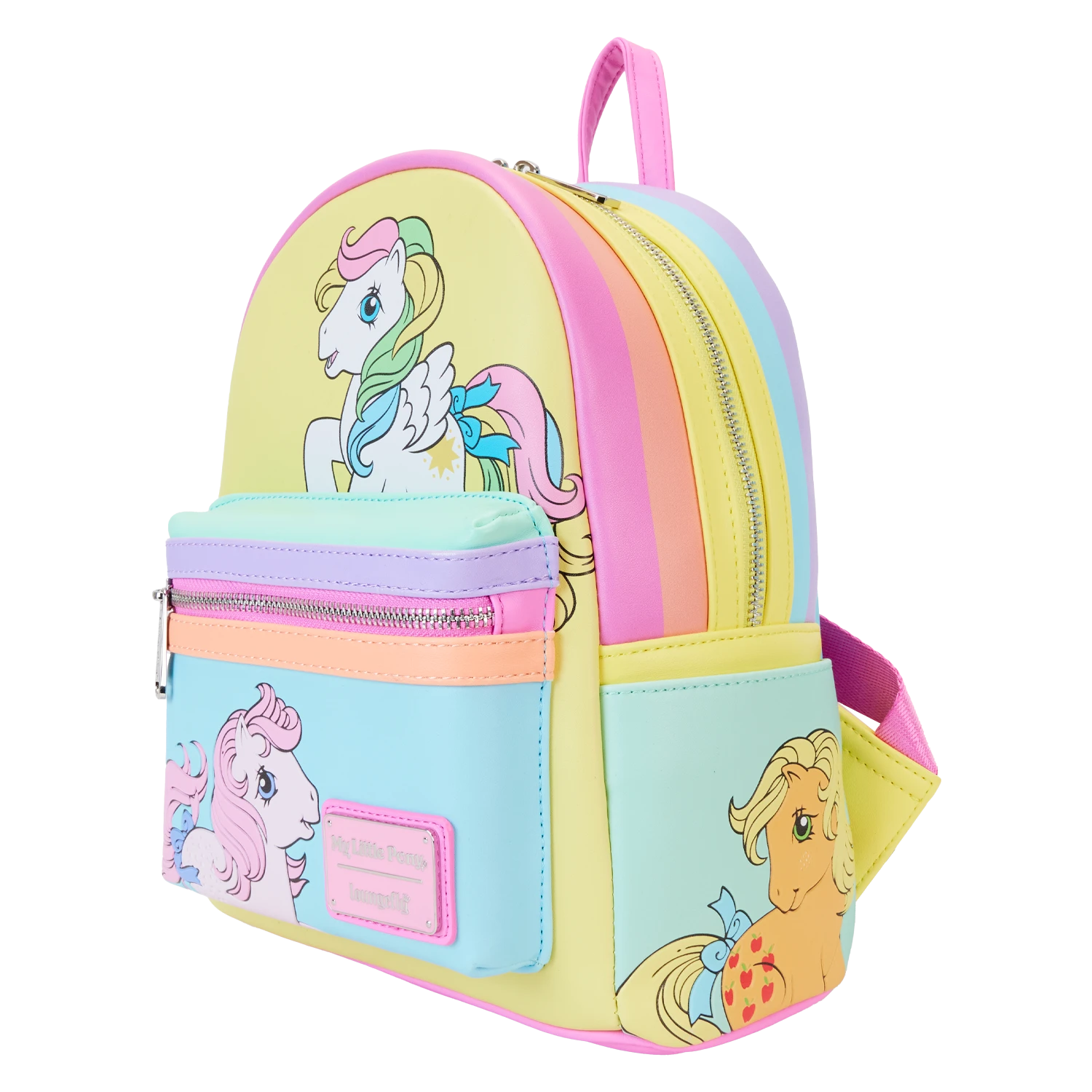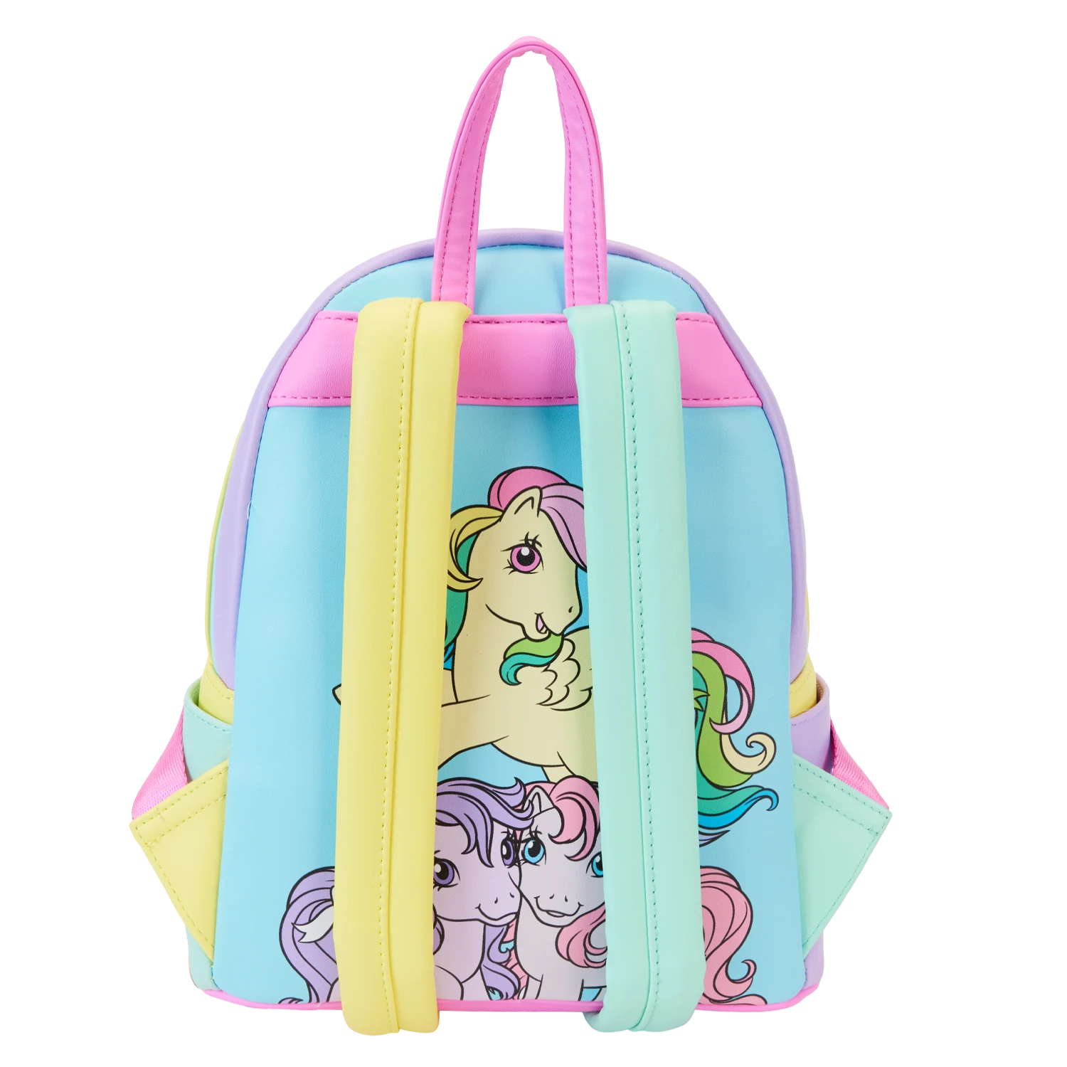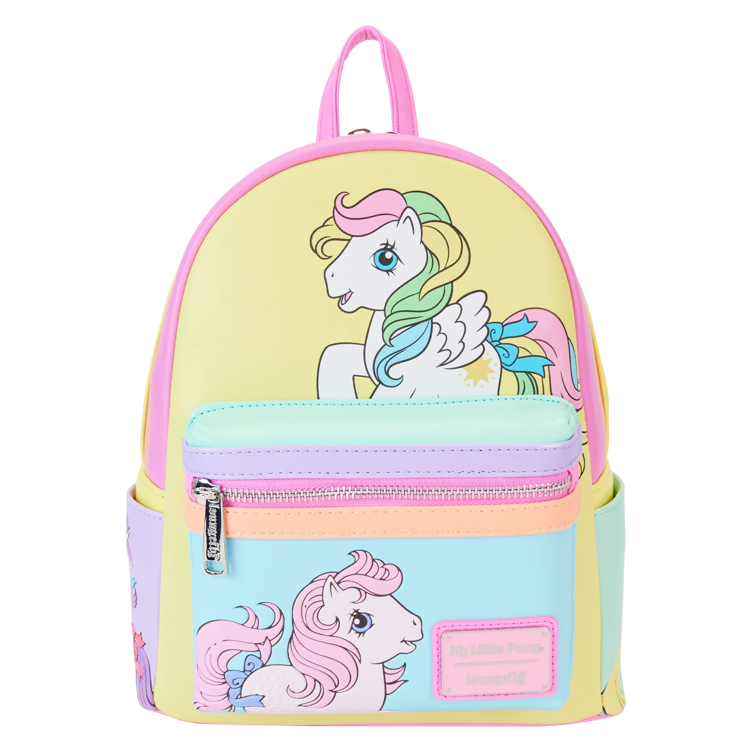 Gallop away with a rainbow of colors! Our My Little Pony Color Block Mini Backpack is perfect for a fun-filled day of magical adventures. Colorful artwork covers all sides of this handy backpack in bold blocks of yellow, pink, seafoam green, purple, and blue. Fan-favorite My Little Pony characters come to life in playful prints. You might spot Starshine, Peachy, Applejack, Glory, Skydancer, Blossom, and Snuzzle. Pack just what you need for the day to take the reins in style.