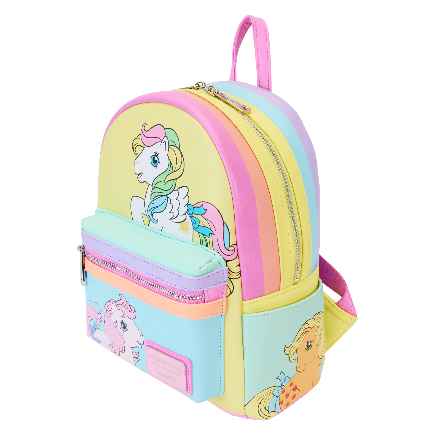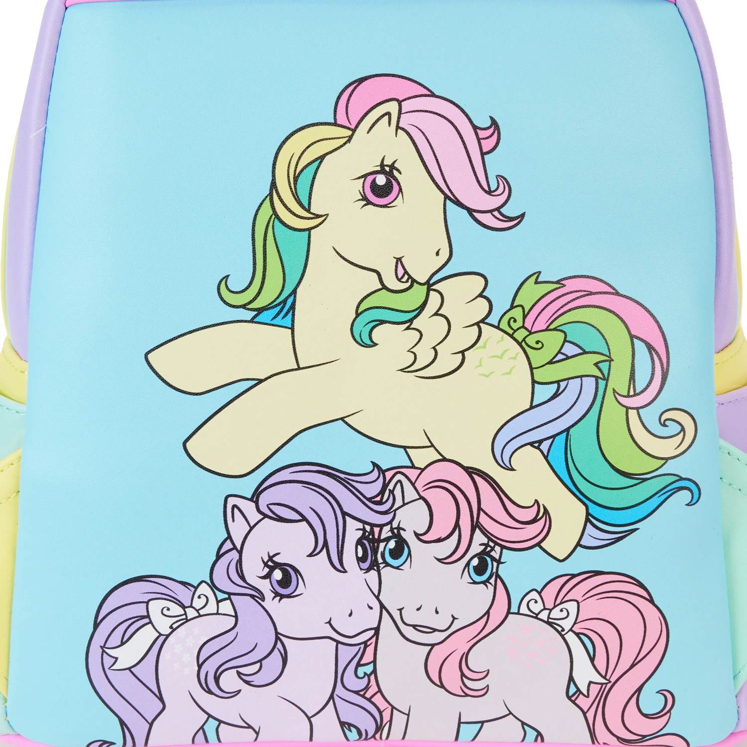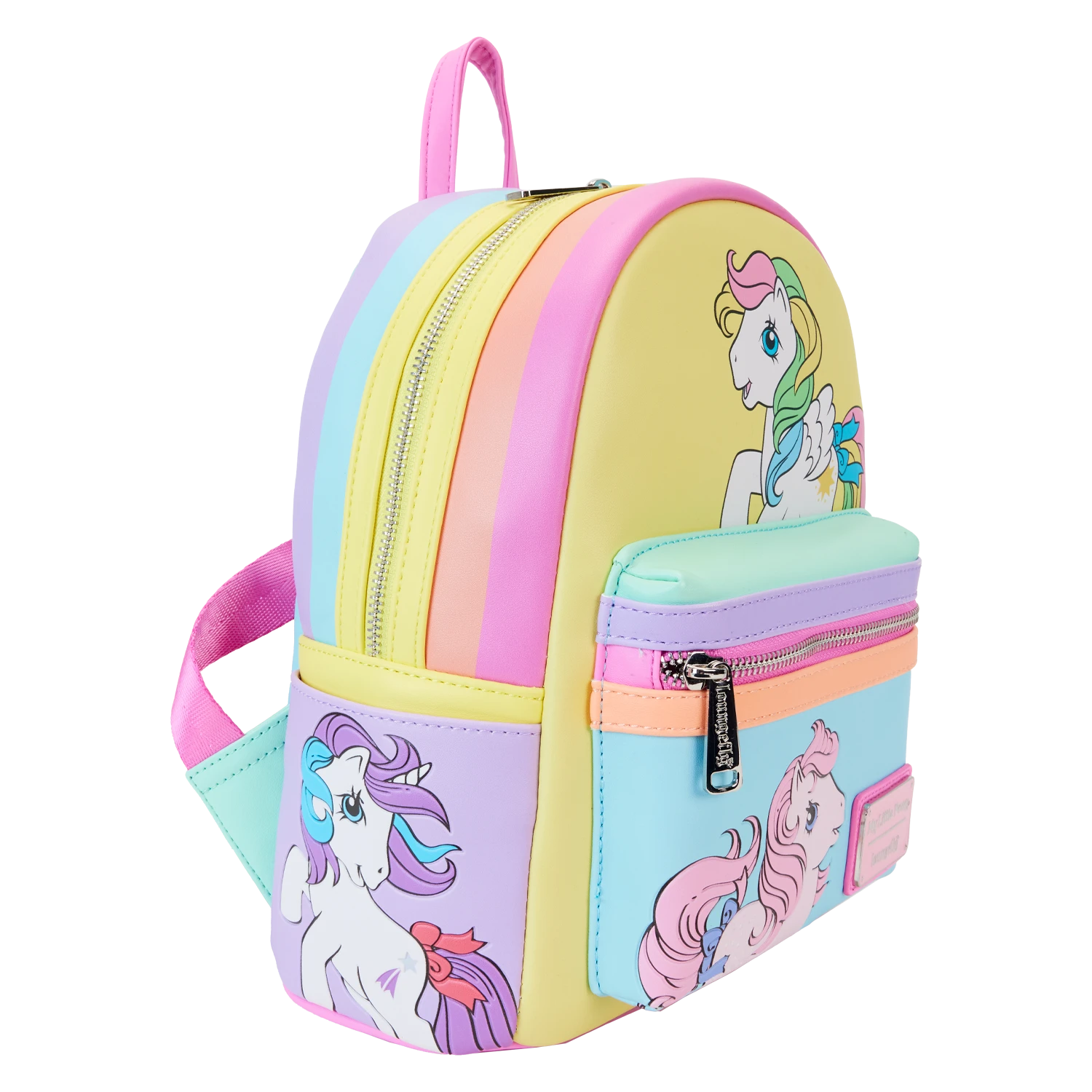 Gallop away with a rainbow of colors! Our My Little Pony Color Block Mini Backpack is perfect for a fun-filled day of magical adventures. Colorful artwork covers all sides of this handy backpack in bold blocks of yellow, pink, seafoam green, purple, and blue. Fan-favorite My Little Pony characters come to life in playful prints. You might spot Starshine, Peachy, Applejack, Glory, Skydancer, Blossom, and Snuzzle. Pack just what you need for the day to take the reins in style.