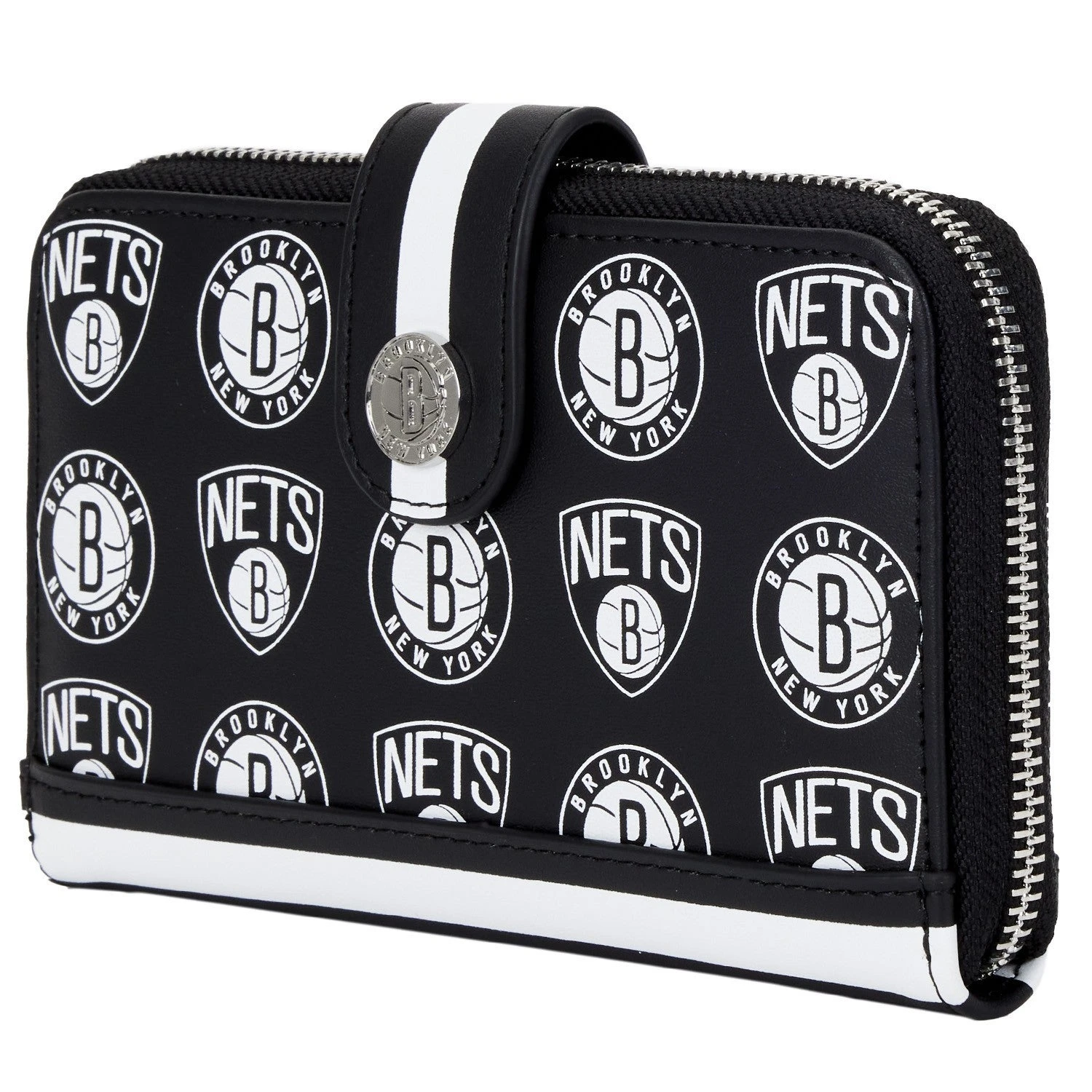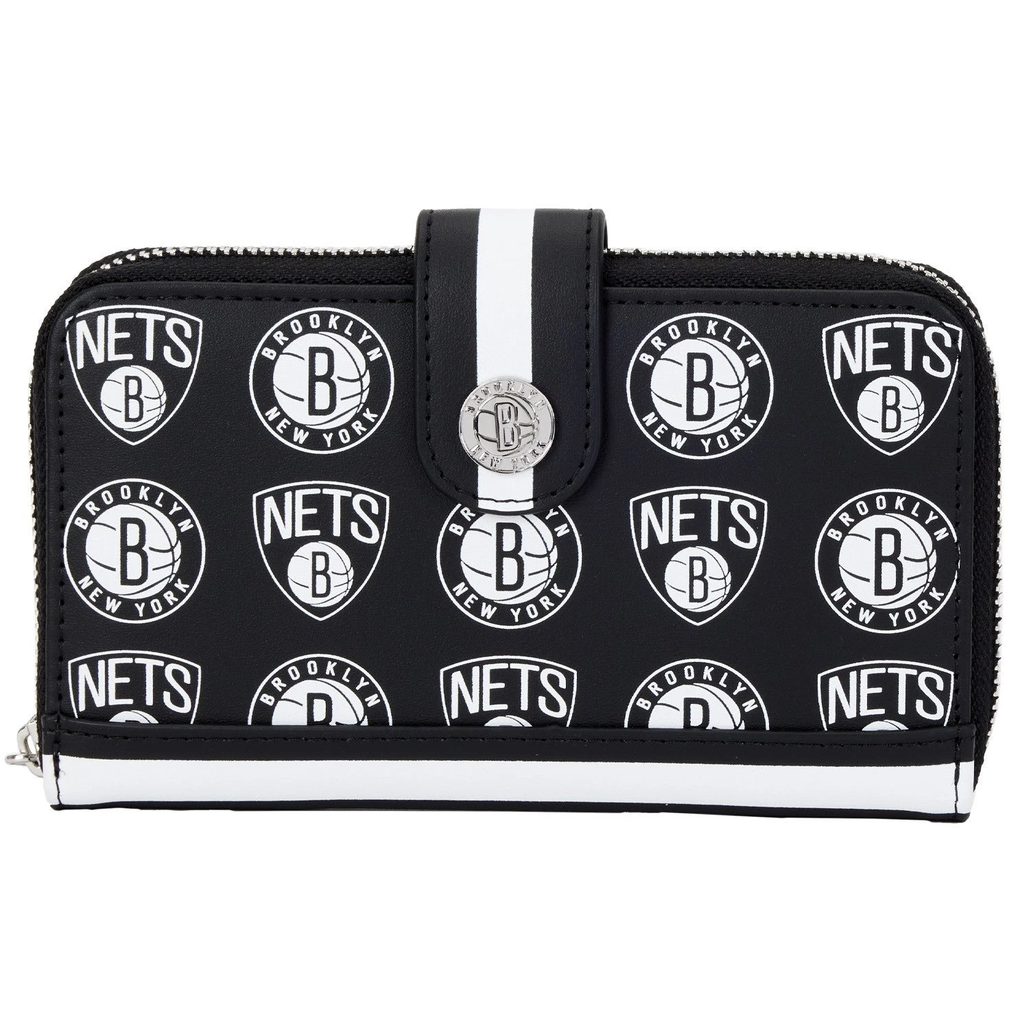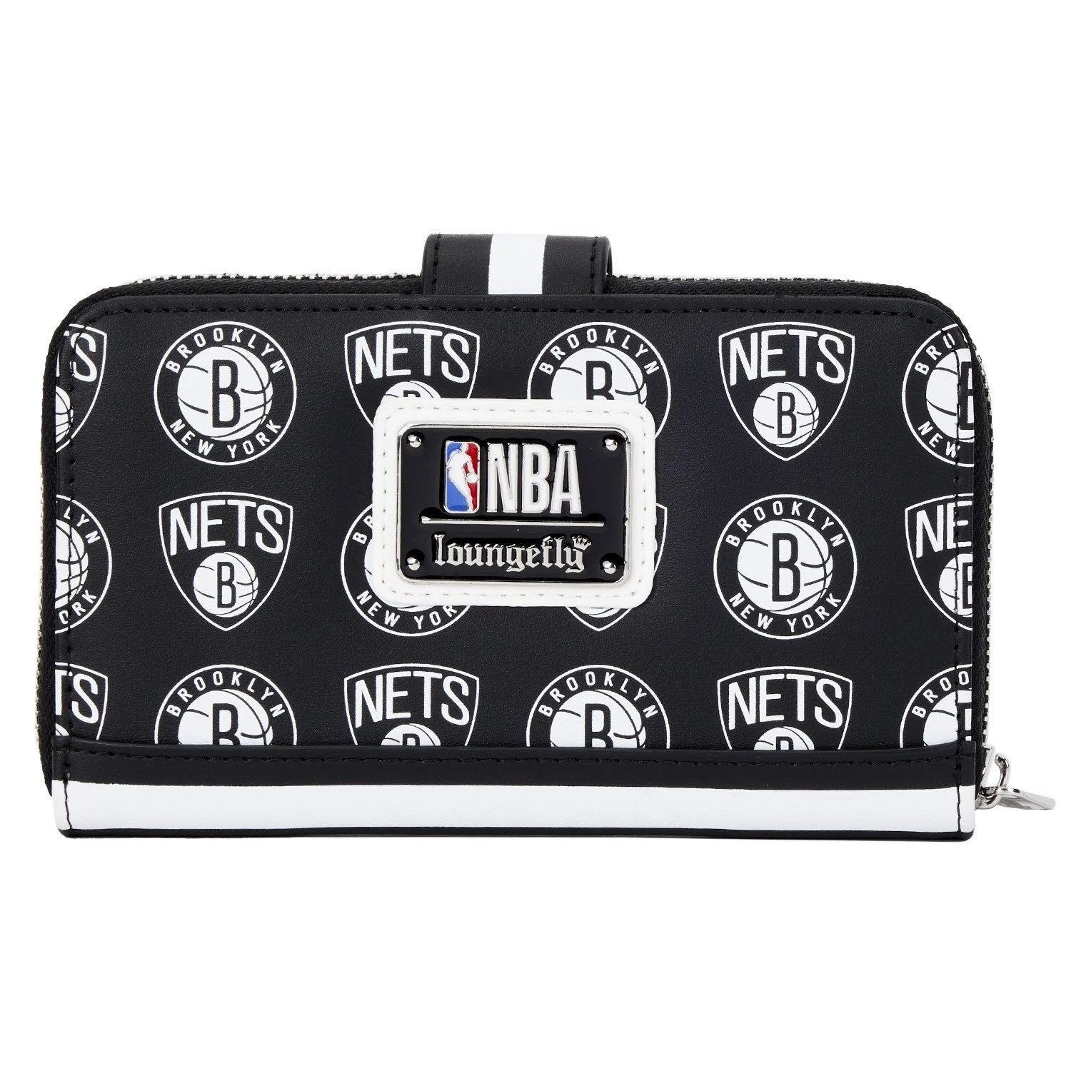 The Loungefly NBA Brooklyn Nets Logo Wallet is made of vegan leather (polyurethane). Wallet zips closed, has sturdy metal hardware, and features: printed details. Take note of the coordinating pattern of the inside lining fabric.