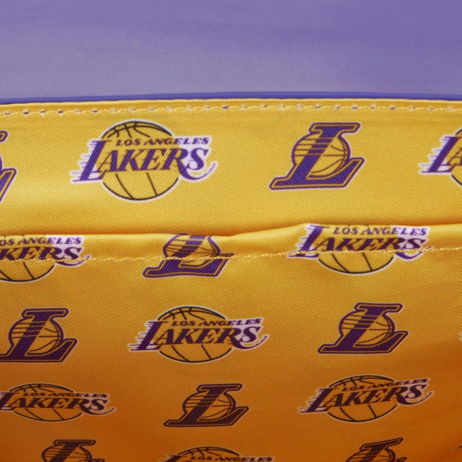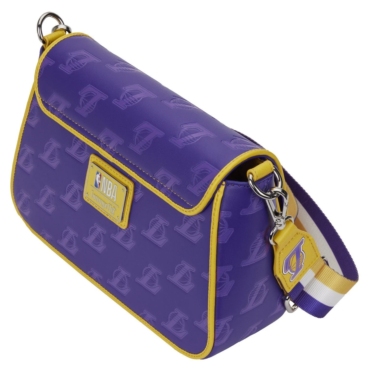 The Loungefly NBA LA Lakers Debossed Logo Crossbody Bag is made of vegan leather (polyurethane). Bag has a shoulder strap, sturdy metal hardware, and features: embroidered, debossed, and printed details. Take note of the coordinating pattern of the inside lining fabric.