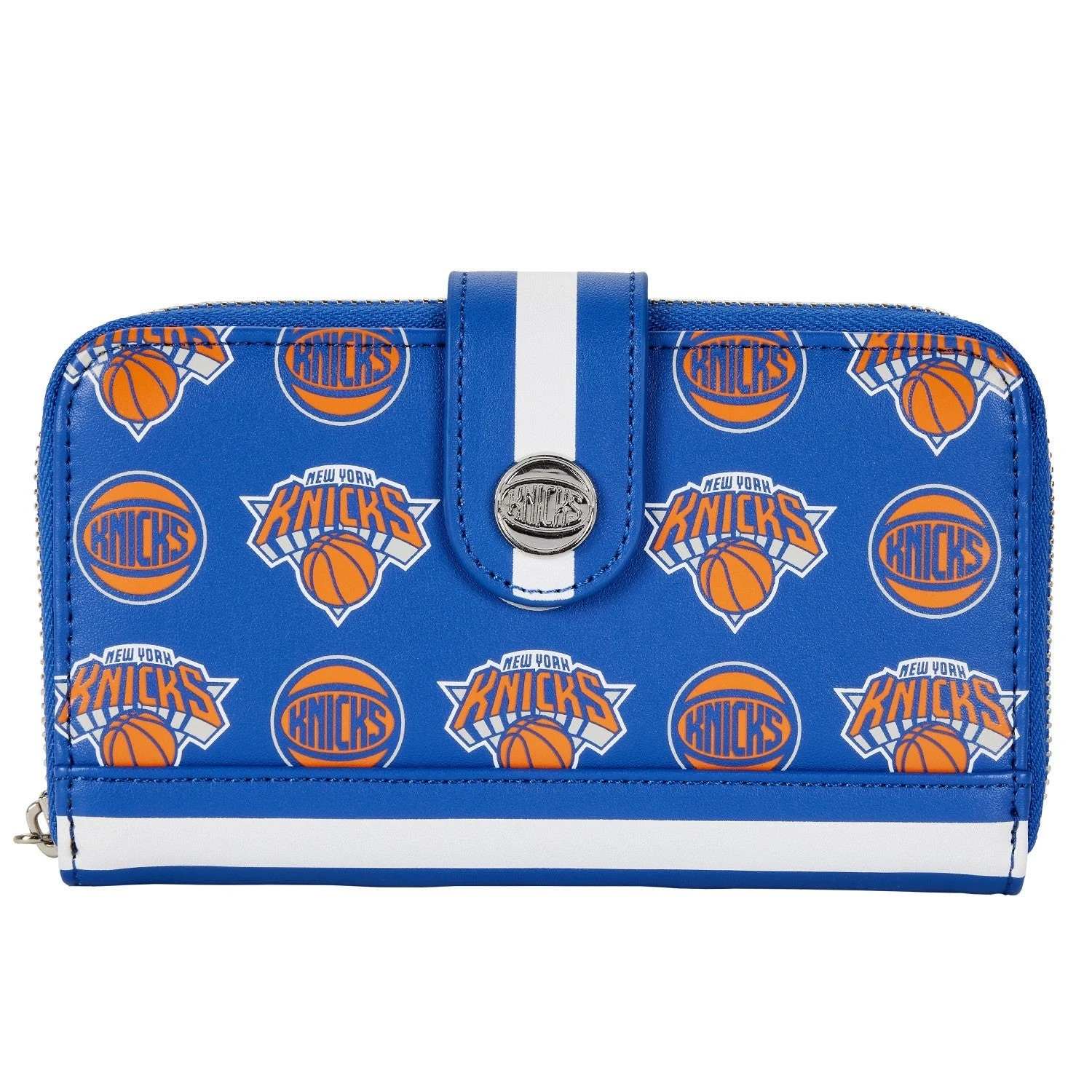 The Loungefly NBA NY Knicks Logo Wallet is made of vegan leather (polyurethane). Wallet zips closed, has sturdy metal hardware, and features: printed details. Take note of the coordinating pattern of the inside lining fabric.