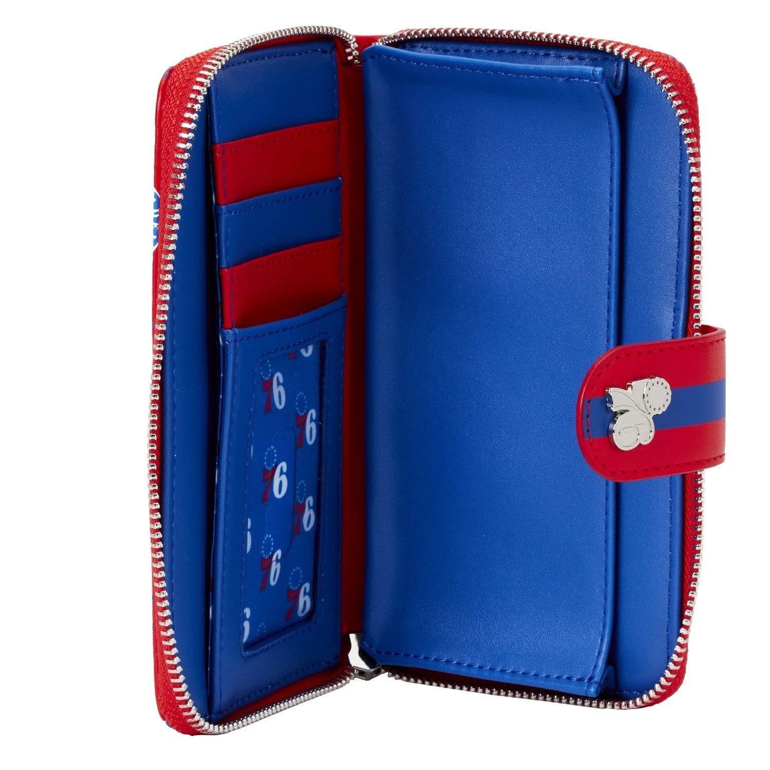 The Loungefly NBA Philly 76ers Logo Wallet is made of vegan leather (polyurethane). Wallet zips closed, has sturdy metal hardware, and features: printed details. Take note of the coordinating pattern of the inside lining fabric.