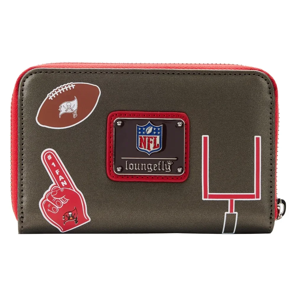 The Loungefly NFL Tampa Bay Buccaneers Patches Zip Around Wallet is made of vegan leather (polyurethane). Wallet zips closed and has sturdy metal hardware. Additional features include applique patch and printed details. Take note of the coordinating inside lining.