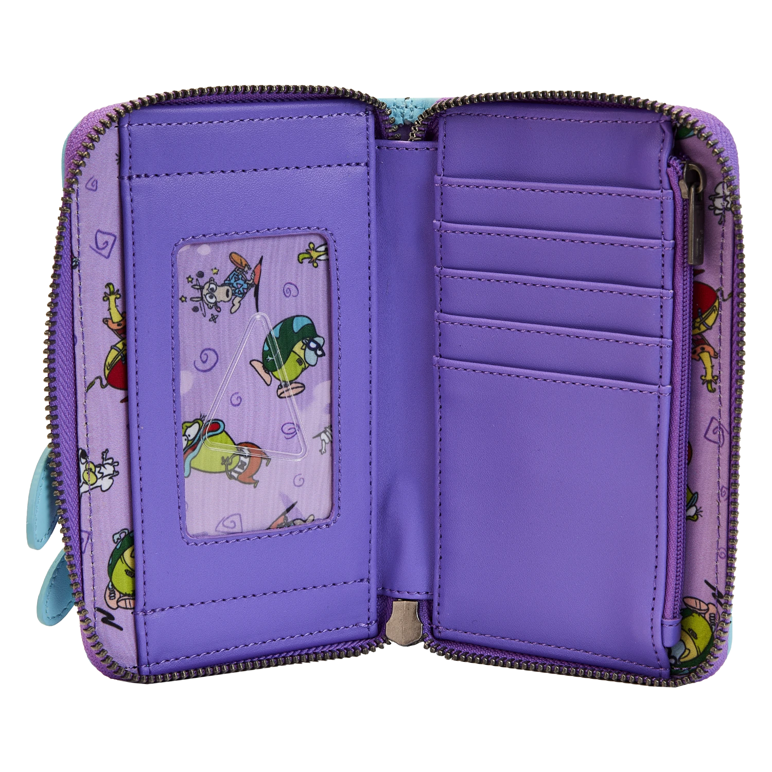 The Loungefly Nickelodeon Rocko’s Modern Life Zip Around Wallet is made of vegan leather (polyurethane). Wallet zips closed and has antique silver-colored metal hardware. Additional features include applique, print, and debossed details. Take note of the coordinating inside lining.