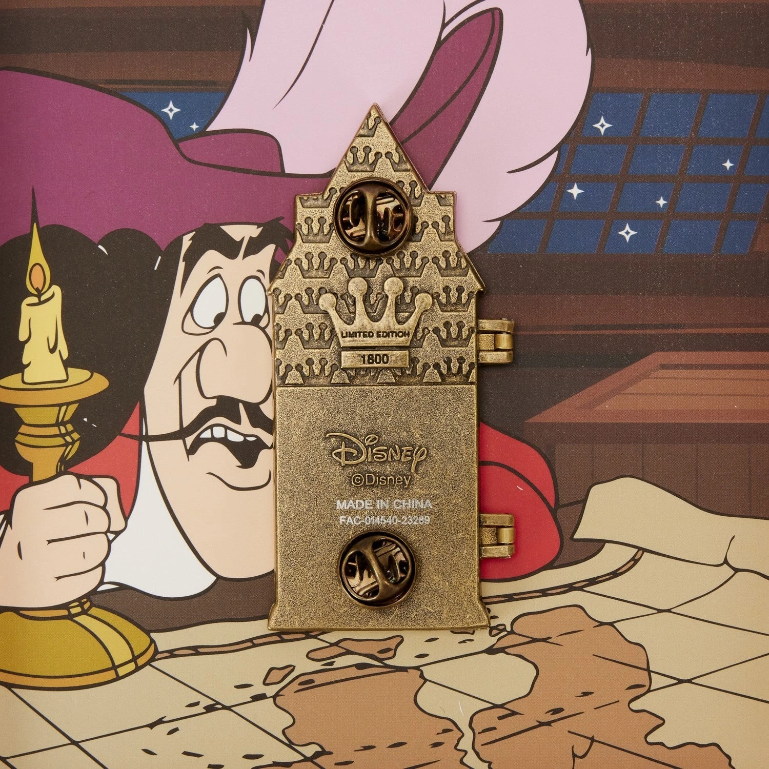 Enamel pin has hinged, glow-in-the-dark, mirrored, and screen-printed details with shiny gold and antique gold hardware. The signature Funko/Loungefly crown debossing appears on the back, noting the limited edition 1,800-piece count.