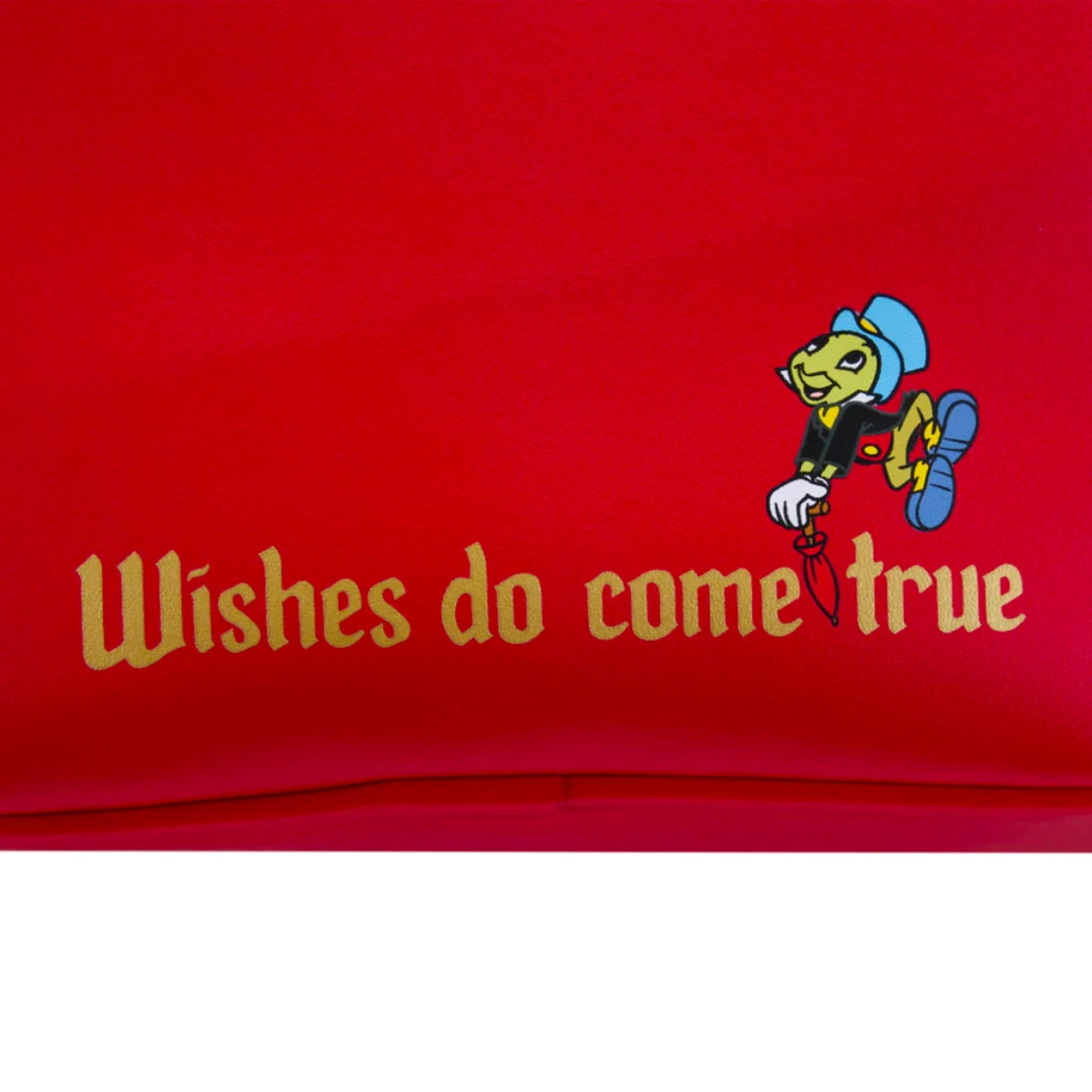 The Pinocchio Marionette Mini Backpack is made of vegan leather (polyurethane). Bag has adjustable shoulder straps, sturdy metal hardware, and features: 3D handle, moveable applique, embroidered, and printed details. Take note of the coordinating design of the inside lining fabric.