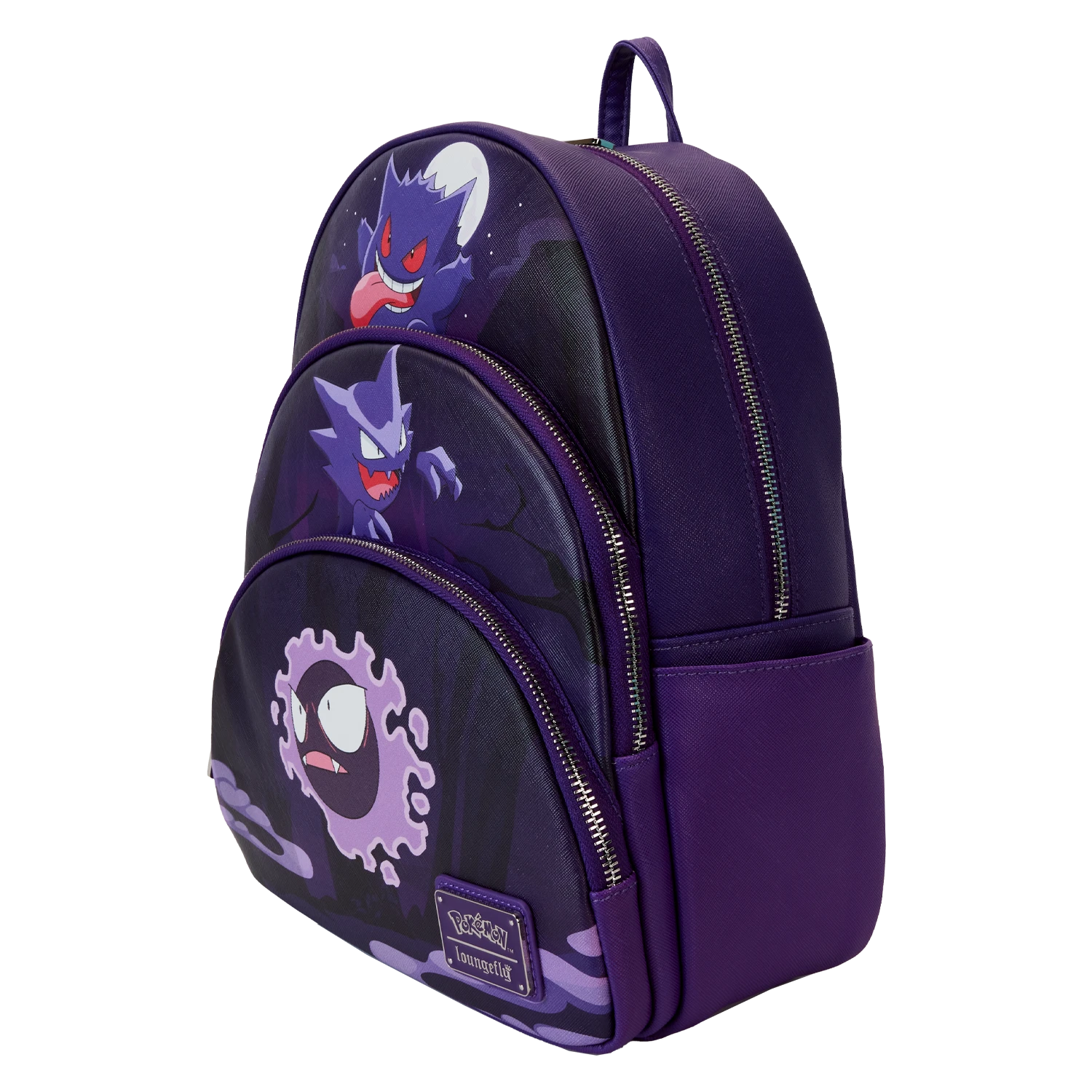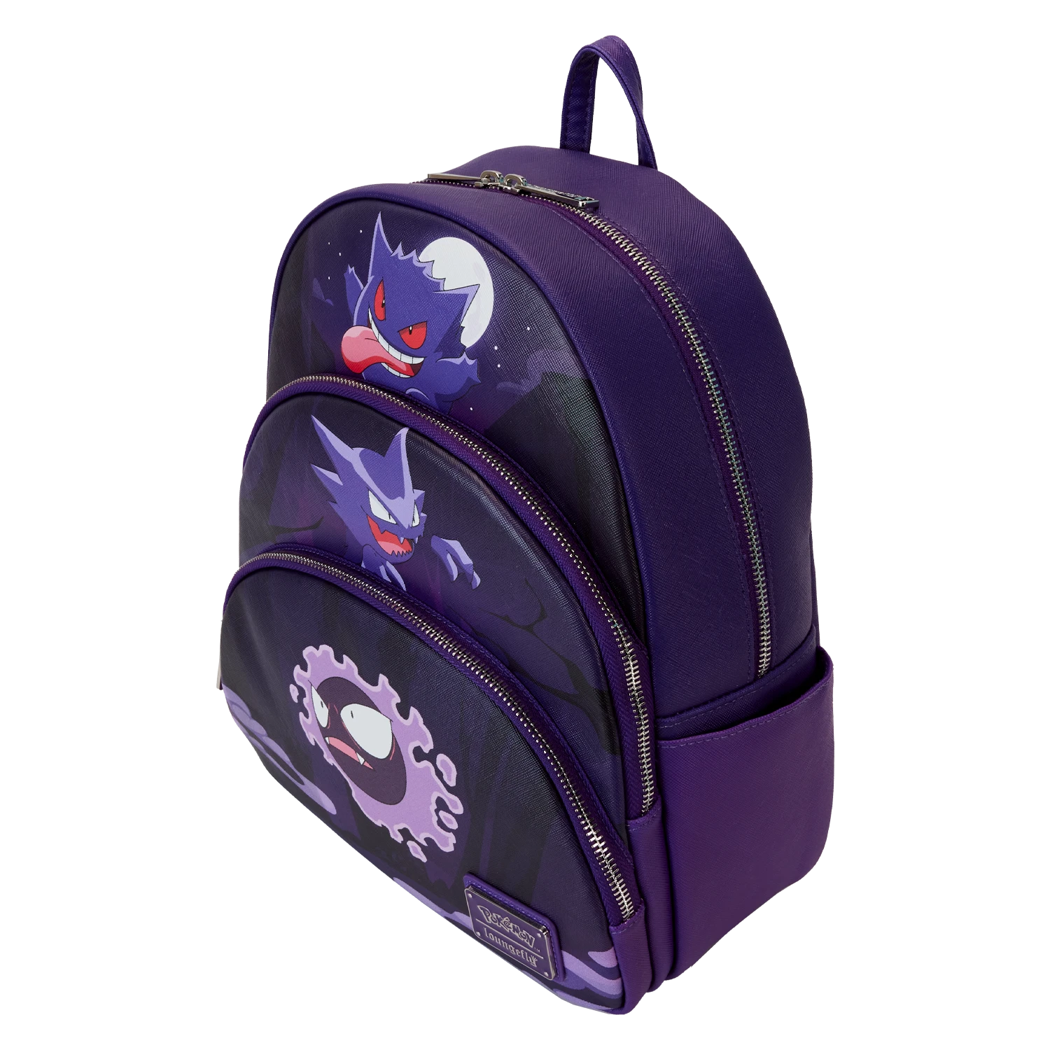 Don’t ghost the chance to evolve your style! Level up with our Loungefly Pokémon Gengar Evolution Triple Pocket Backpack. This roomy, dark purple backpack features the evolution of Gengar on each of the three pockets: Gastly, Haunter, and Gengar. Their faces and forms come to life in debossed detail. On the back, all three evolutions of Gengar make an encore appearance in shadow form. Pack and organize just what you need for the day to play on!