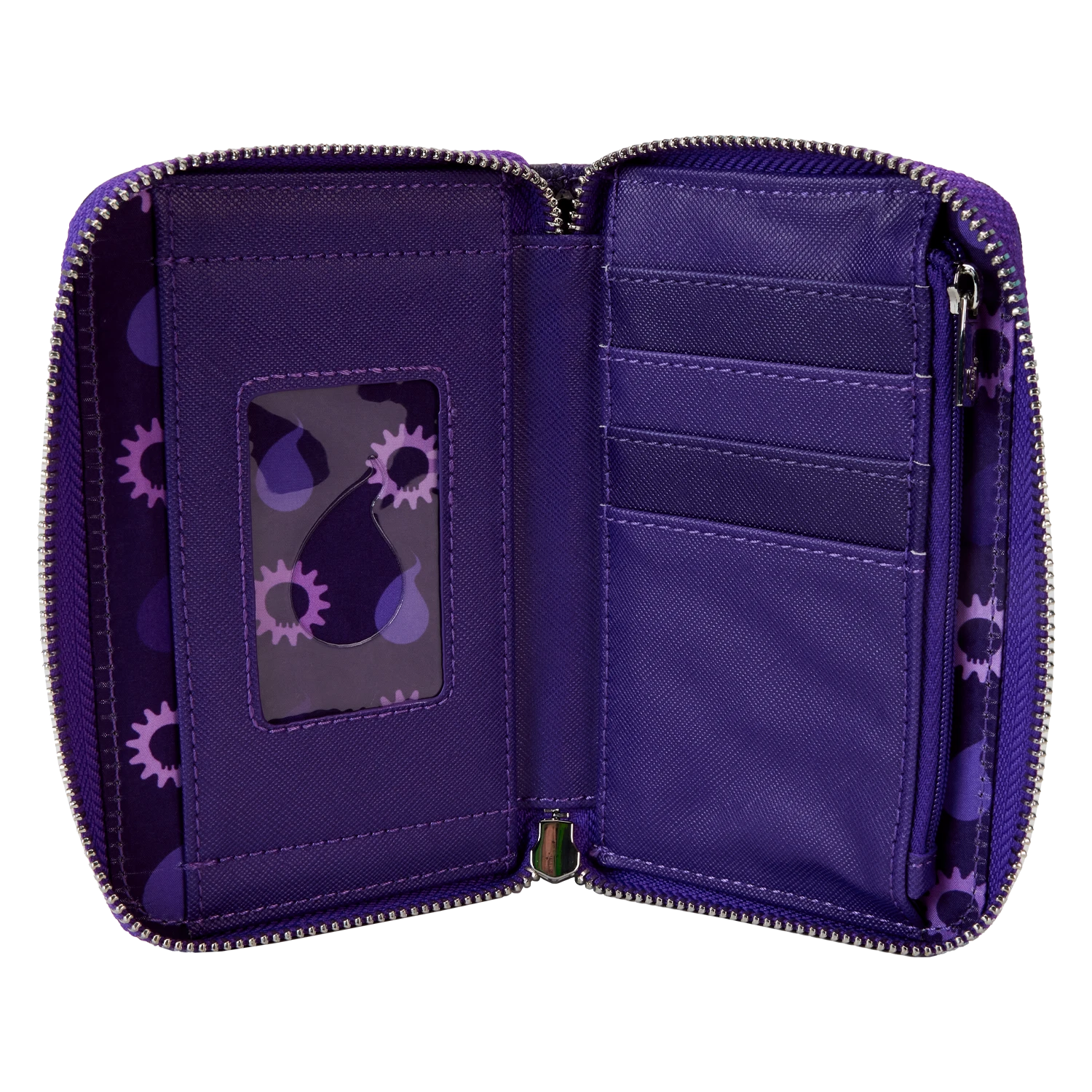 The Loungefly Pokémon Gengar Zip-Around Wallet is made of vegan leather (polyurethane). Wallet zips closed with silver-colored metal hardware. Additional features include debossed and printed details. Take note of the coordinating inside lining.