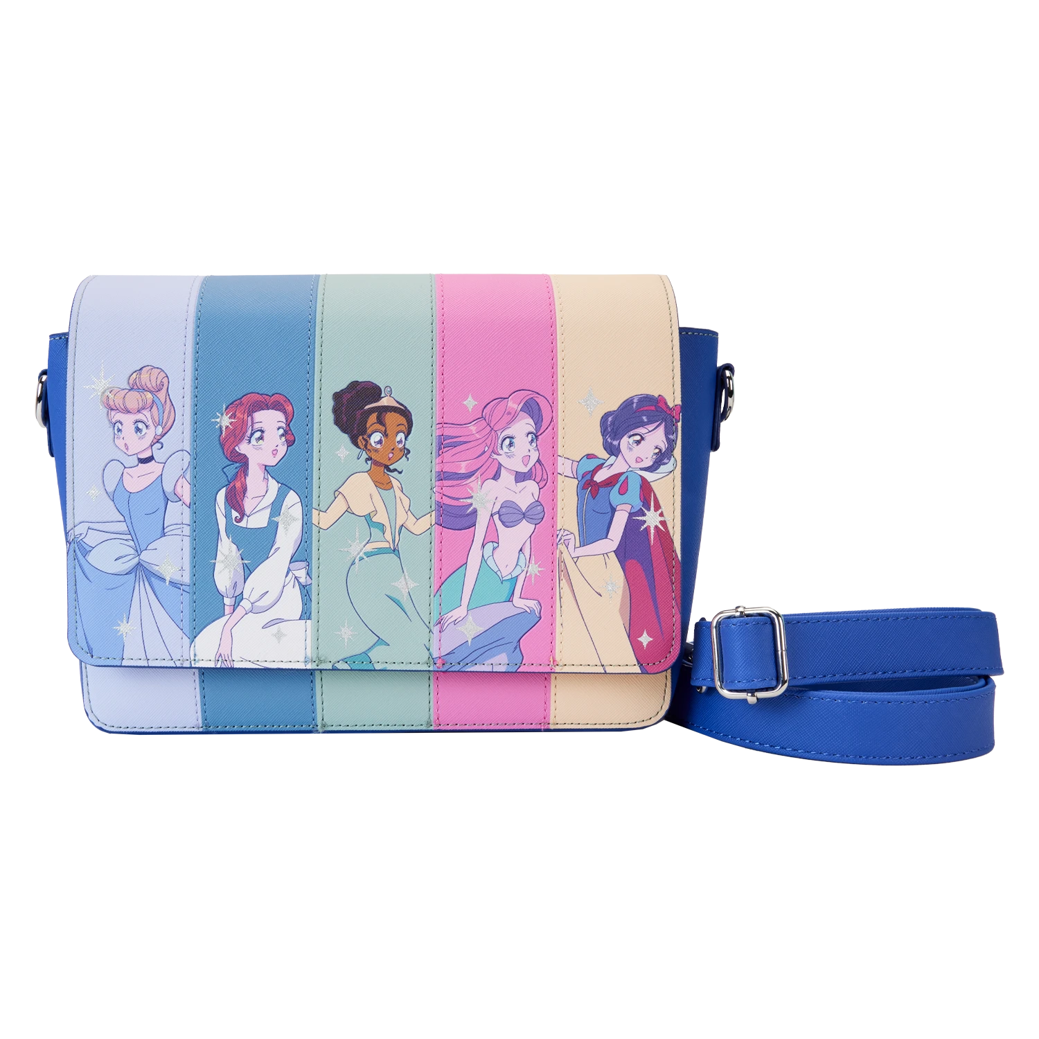Star-struck by magical stories? Get drawn into our Loungefly Princess Manga Style Crossbody Bag. This colorful bag features a variety of Princess characters, drawn in manga style, wide-eyed with wonder. A corresponding color block stripe serves as a background. You’ll find Cinderella against a light blue background, Belle against a blue background, Tiana against a soft green background, Ariel against a pink background, and Snow White against a yellow background. Silver diamond and “starburst” details surround them. Lift the flap, and you’ll find printed image symbols associated with each character, including a glass slipper, the Enchanted Rose inside the glass dome, a cupcake decorated in Tiana’s dress colors, and the candlestick with silverware that Ariel finds in the grotto. On the back, the color-blocking stripes continue for a complete look. An adjustable and removable shoulder strap adds convenience. Pack just what you need for the day to embrace all kinds of adventures.