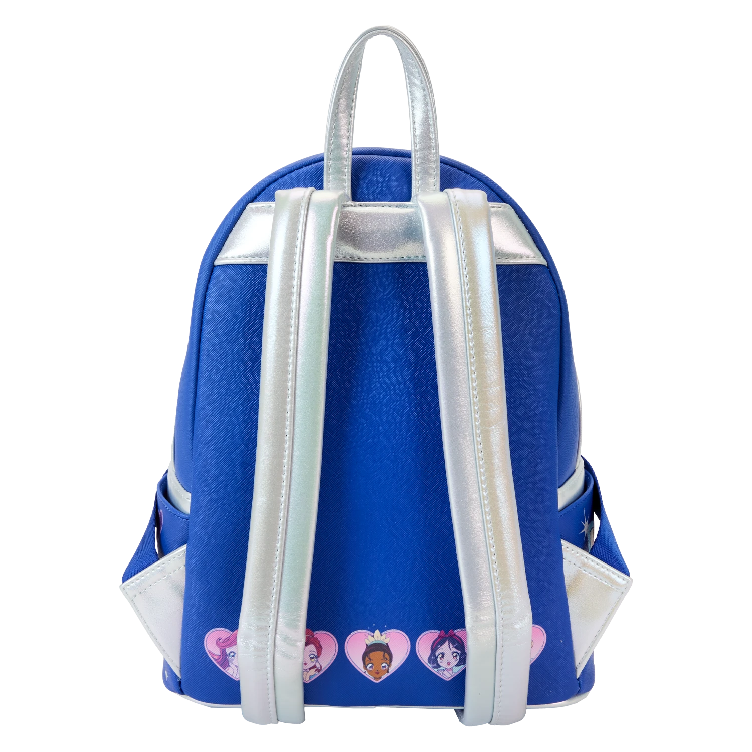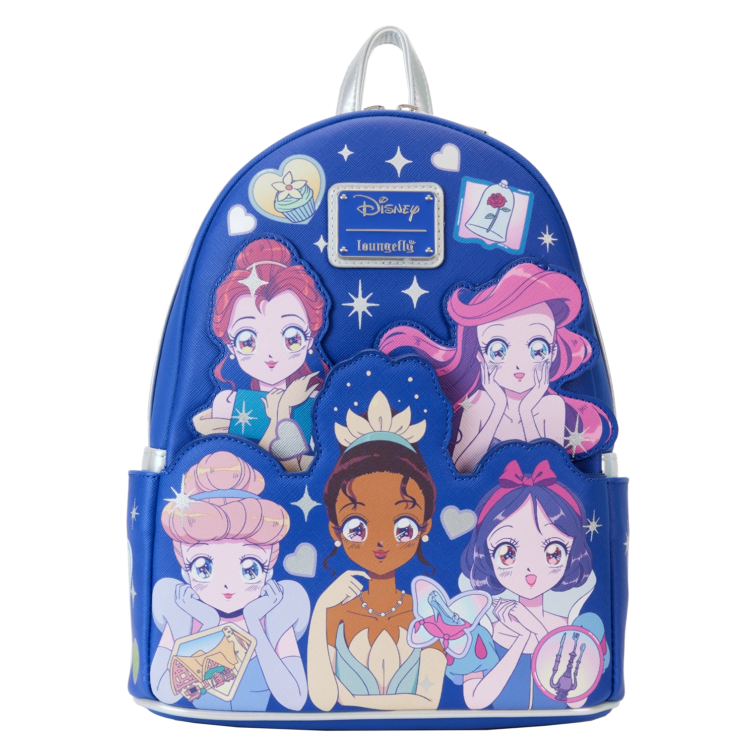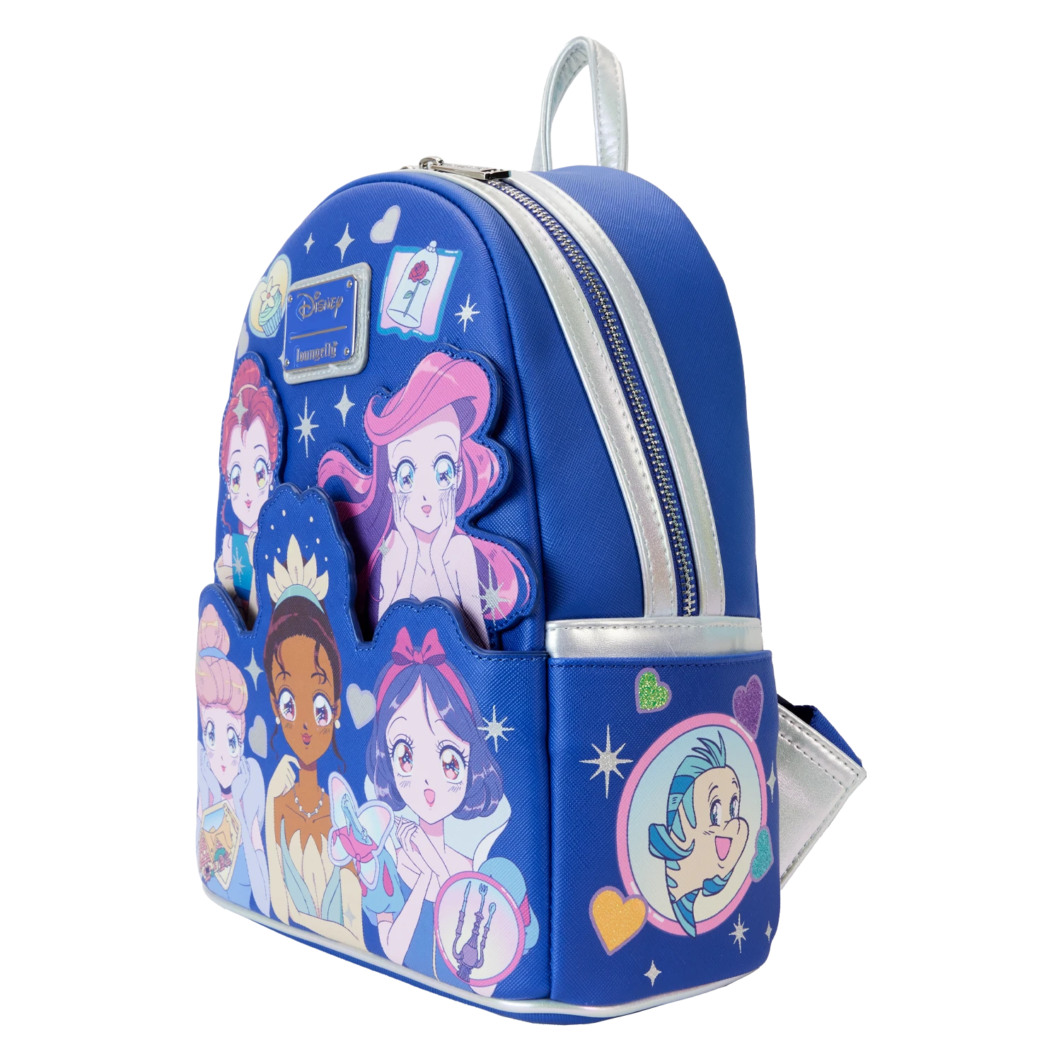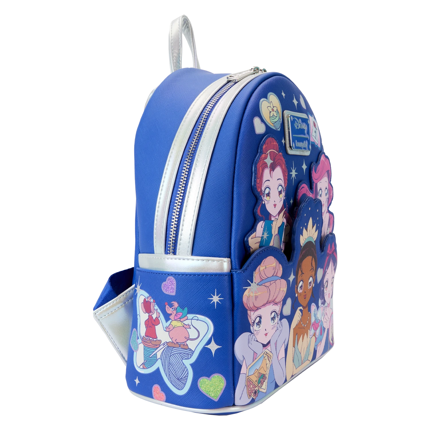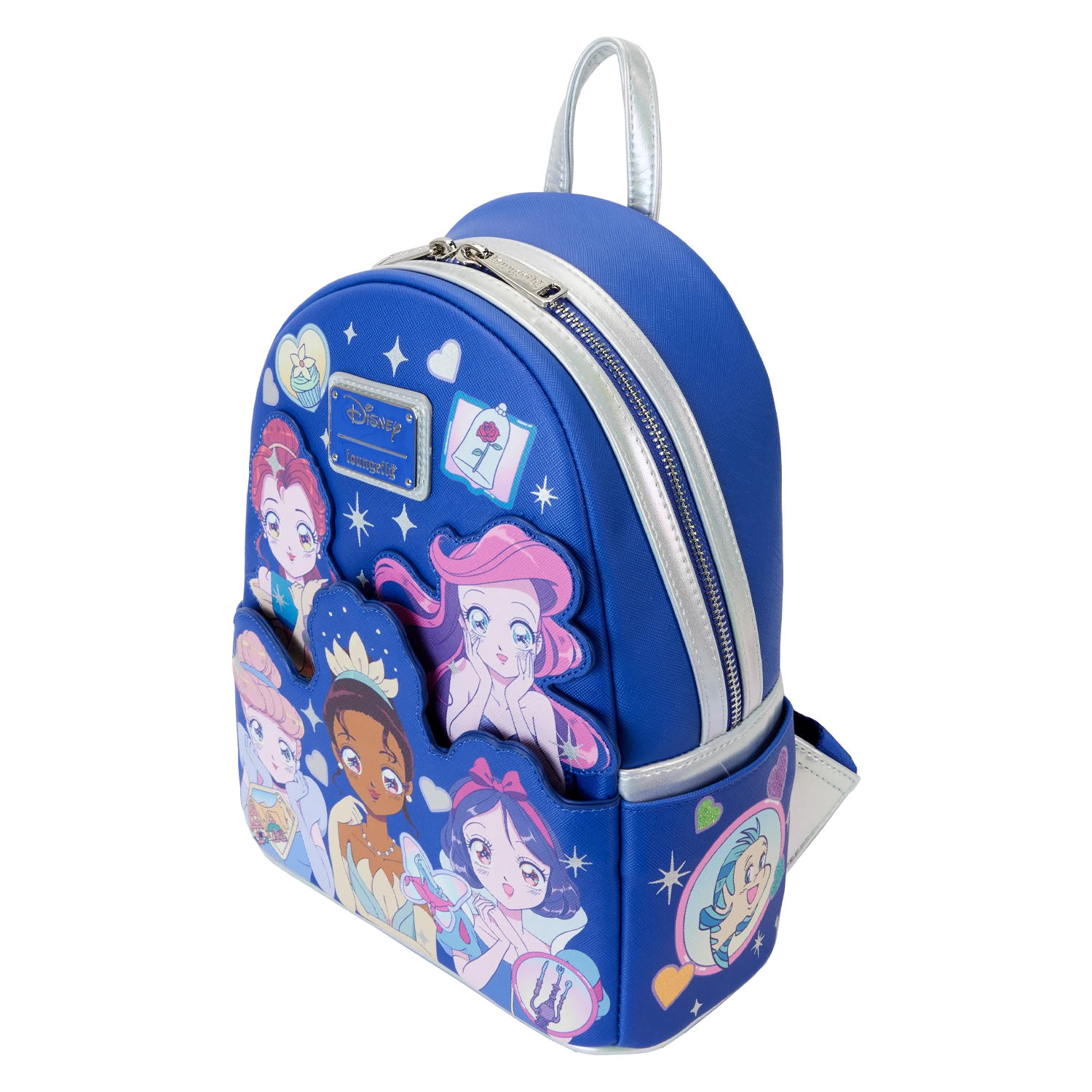 The Loungefly Princess Manga Style Mini Backpack is made of vegan leather (polyurethane). Backpack has padded adjustable shoulder straps, side pockets, and silver-colored metal hardware. Additional features include applique, glitter, printed, silver foil, iridescent, and debossed details. Take note of the coordinating inside lining.