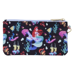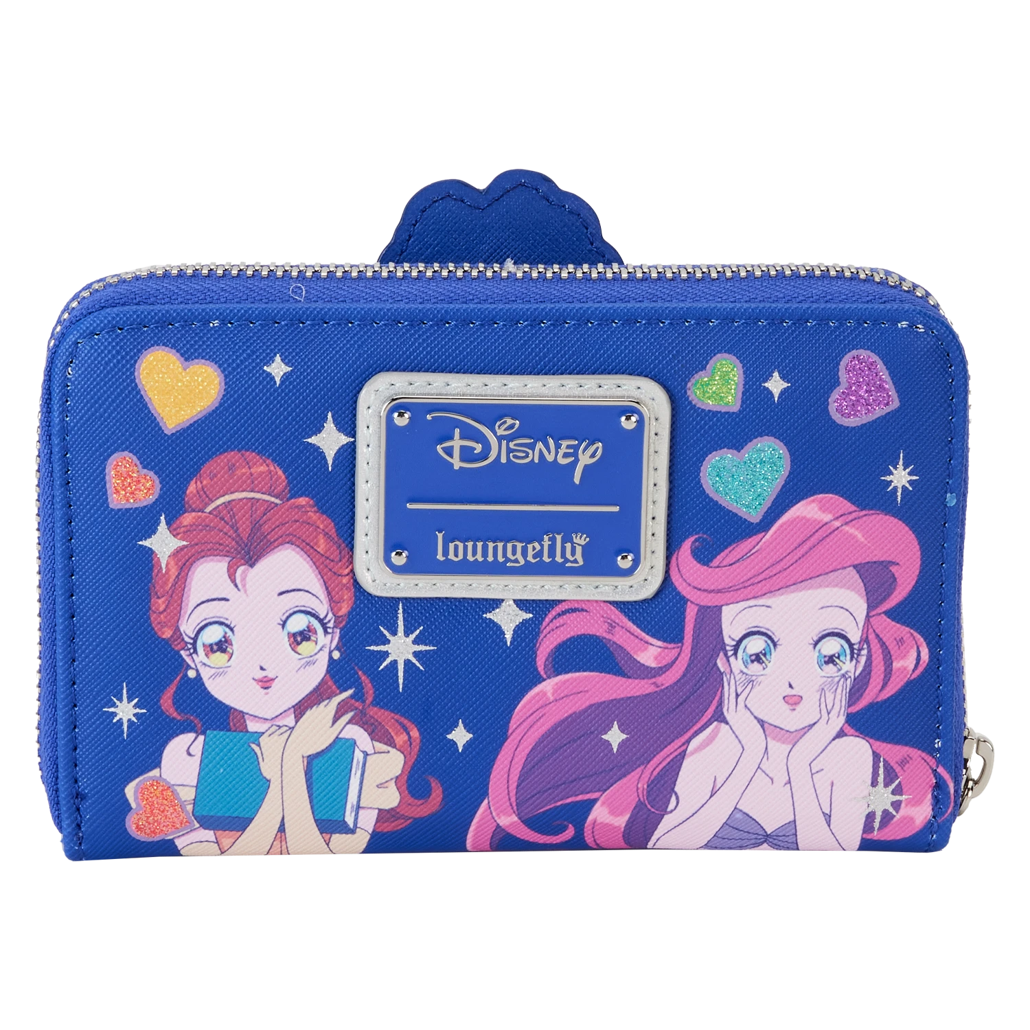 Star-struck by magical stories? Get drawn into our Loungefly Princess Manga Style Zip-Around Wallet. This royal blue accessory features Princess characters in quintessential manga style, wide-eyed and full of wonder. On the front, a die-cut applique print of various Princess characters appears, including Cinderella, Tiana, and Snow White. Colorful glittery hearts surround them, along with silver “starbursts” and diamonds. On the back, the glitter hearts and silver details surround Belle and Ariel. Inside, you’ll find four slots for holding cards and one clear slot for displaying your ID. A die-cut shape of a heart, on the clear slot, adds a lovely touch. Secure your valuables for the day and embrace all kinds of adventures.