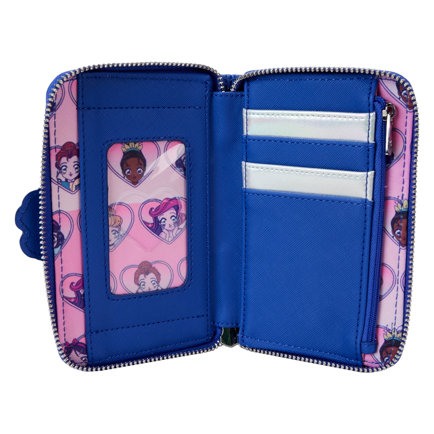 The Loungefly Princess Manga Style Zip-Around Wallet is made of vegan leather (polyurethane). Wallet zips closed with silver-colored metal hardware. Additional features include applique, glitter, iridescent, and printed details. Take note of the coordinating inside lining.