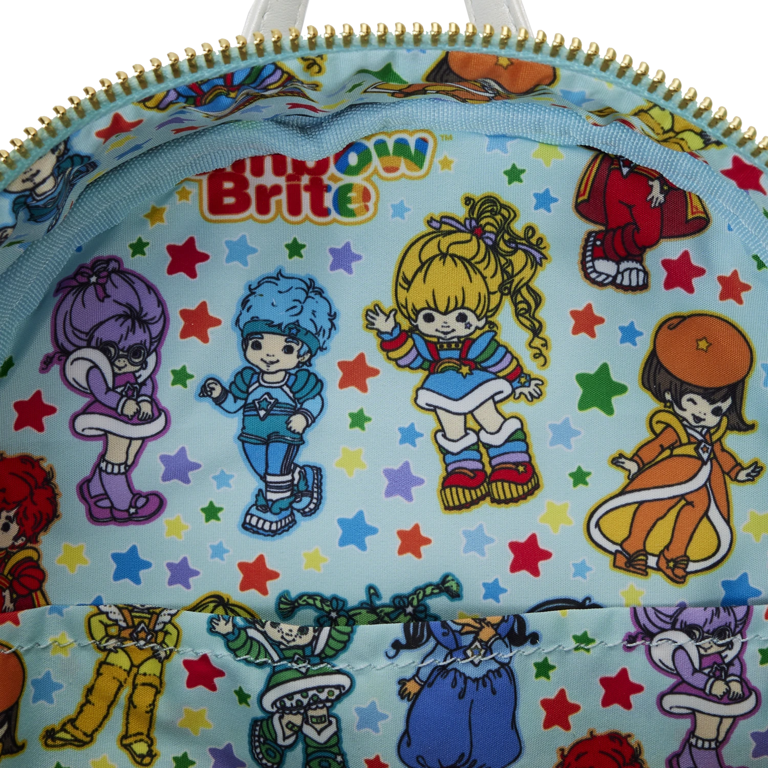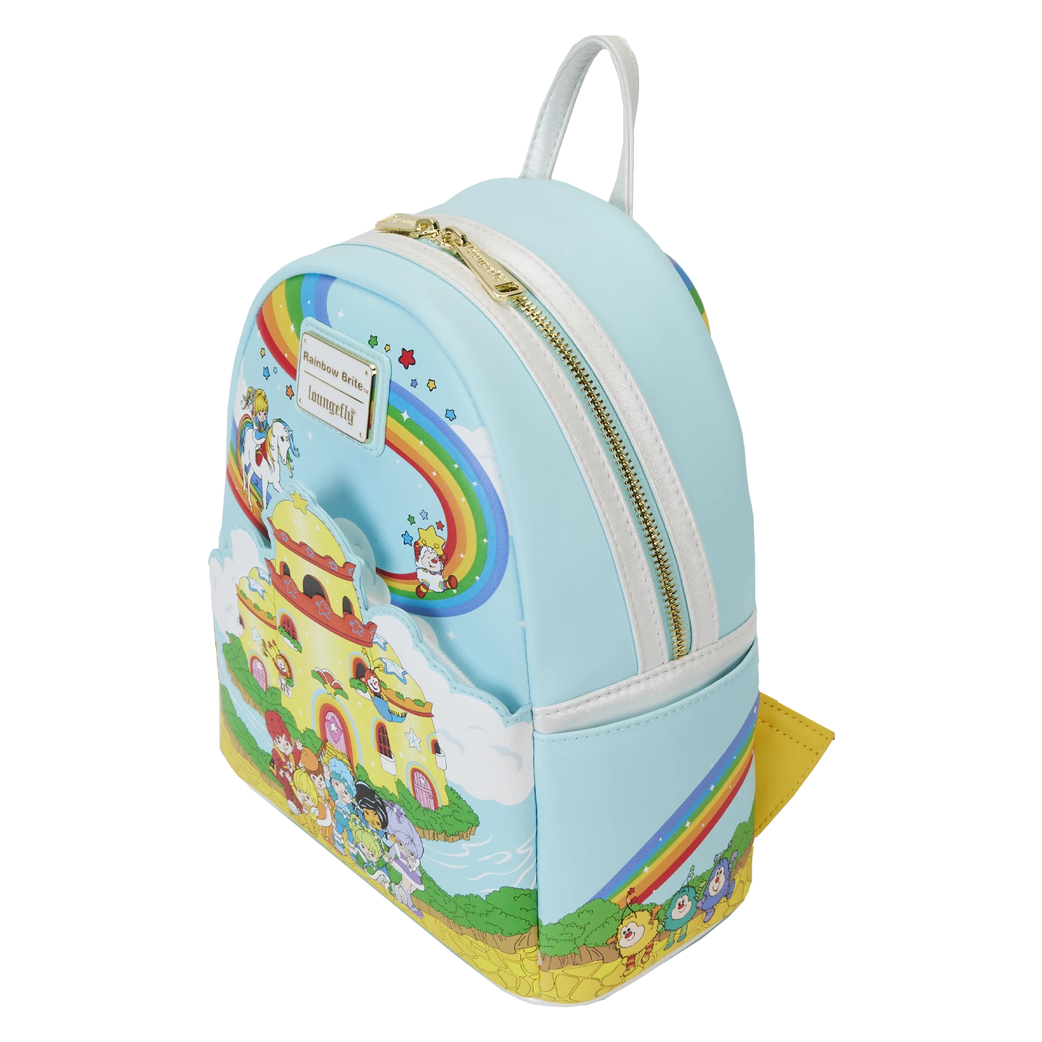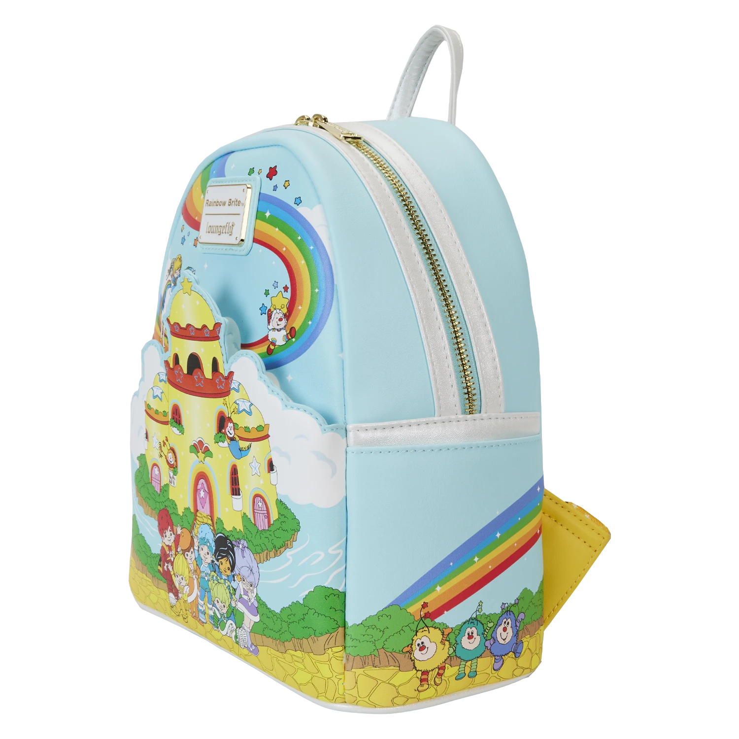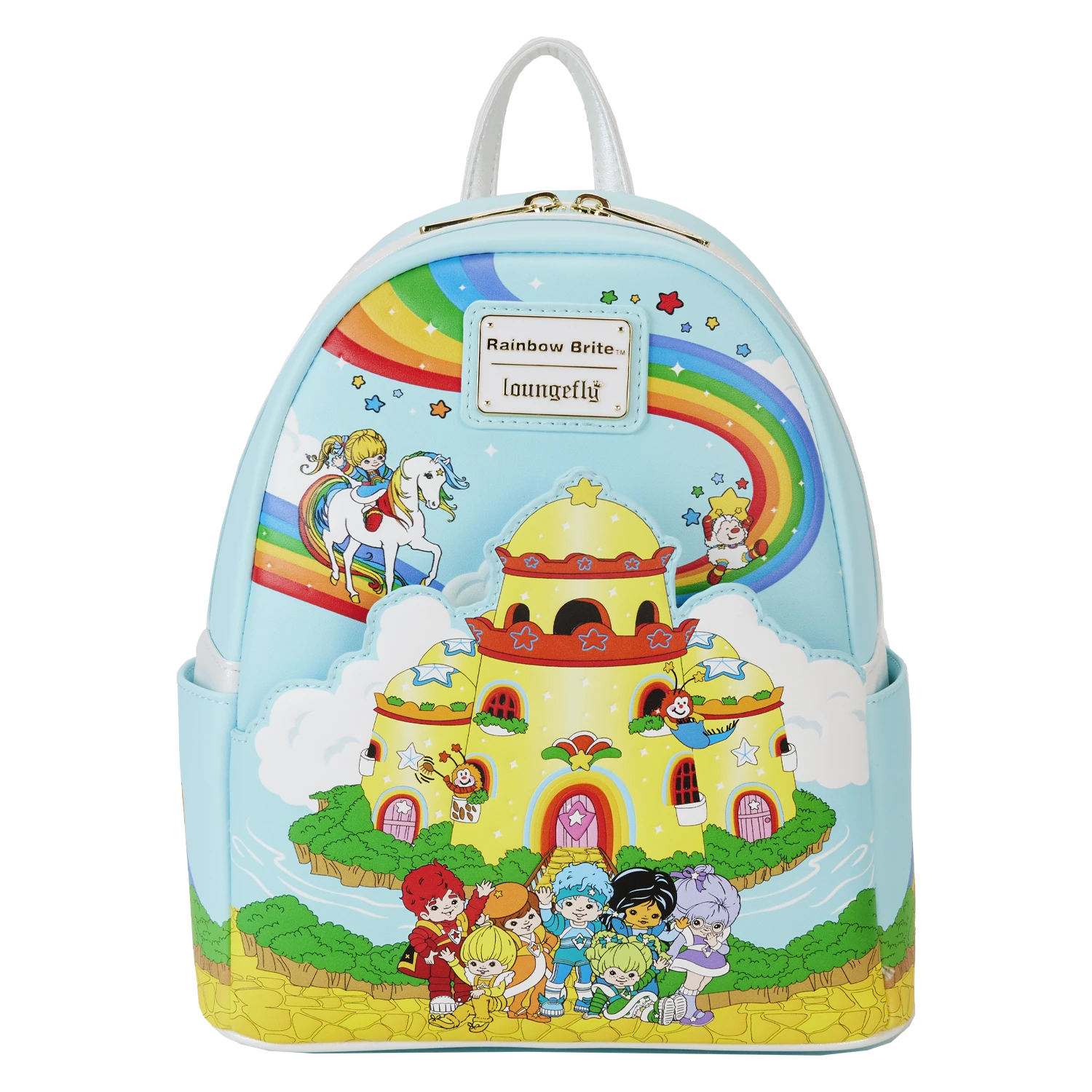 The Loungefly Rainbow Brite Castle Group Mini Backpack is made of vegan leather (polyurethane) with glitter trim. Bag has adjustable shoulder straps and shiny gold hardware. Additional features include applique, embossed, and printed details. Take note of the coordinating inside lining.