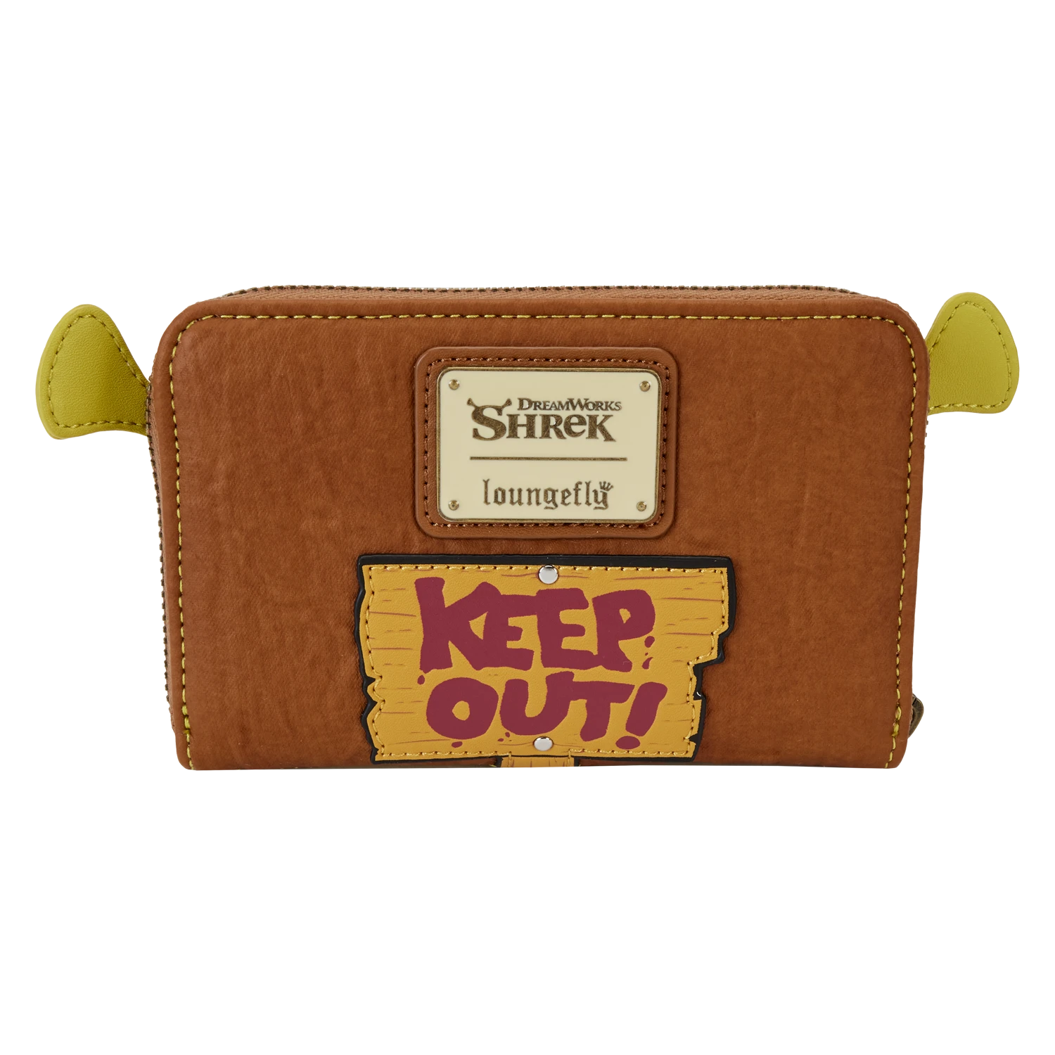 The Loungefly Shrek Keep Out Cosplay Zip-Around Wallet is made of vegan leather (polyurethane). Wallet zips closed with antique gold-colored metal hardware. Additional features include applique, embroidered, and printed details. Take note of the coordinating inside lining.