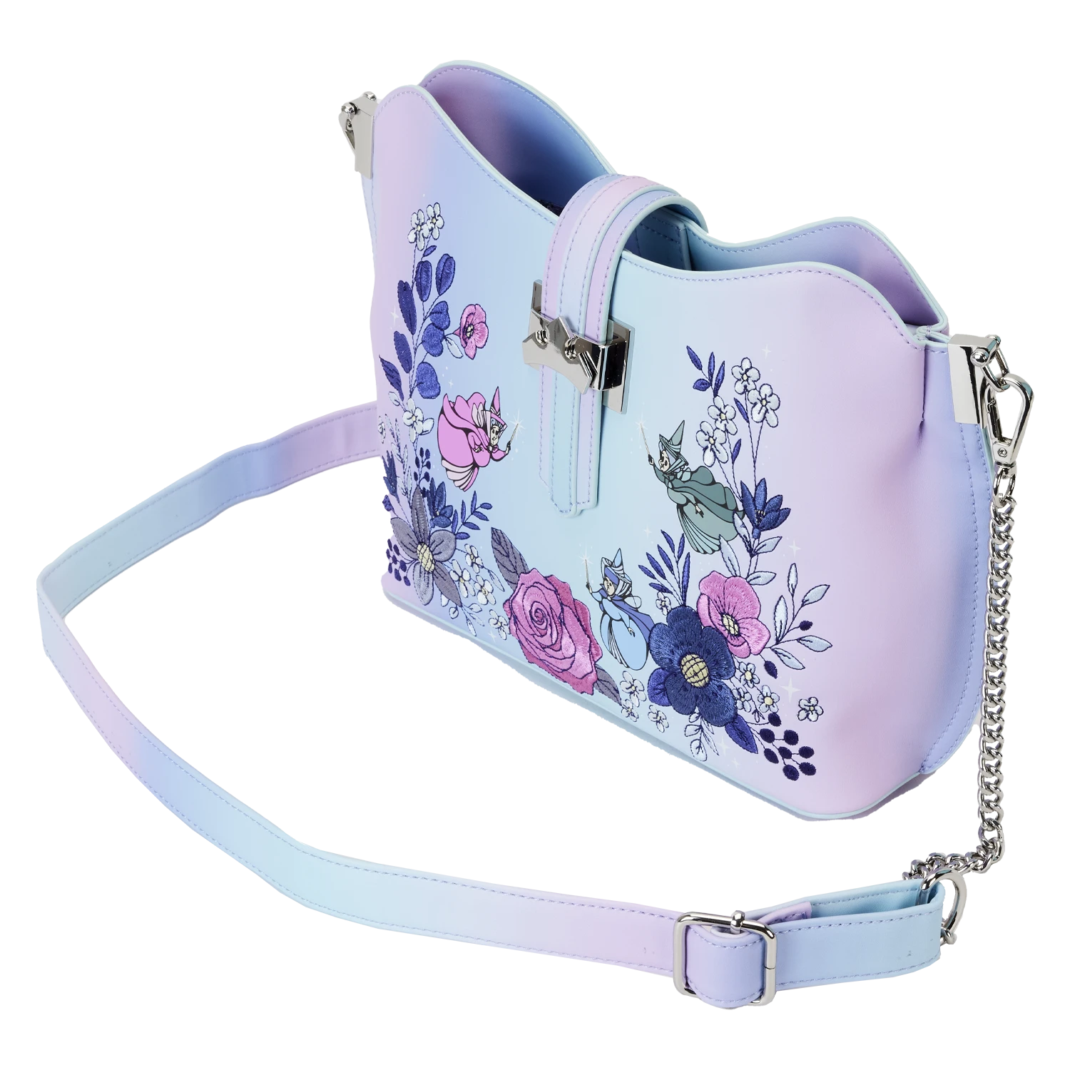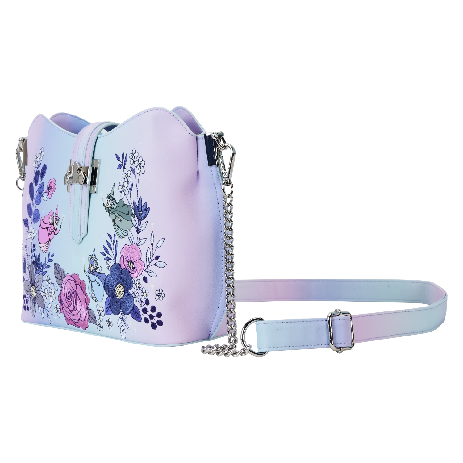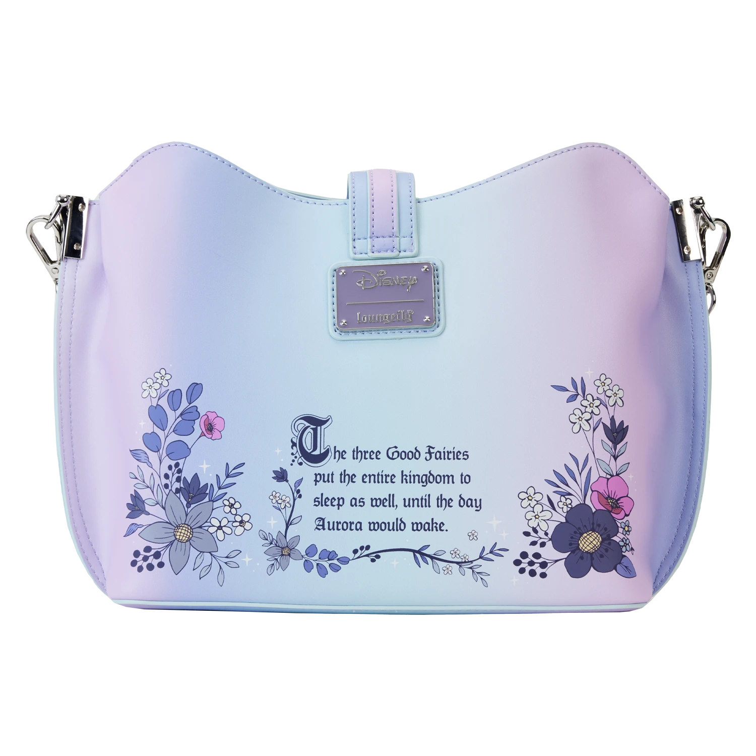 No need to prick your finger on a spinning wheel, this collection is a dream come true! Step into the timeless tale of this animated classic with the Loungefly Sleeping Beauty 65th Anniversary Floral Crown Crossbody Bag. Embroidered flowers frame the front of this accessory, which features an enchanting ombre gradient across its body. The fairies Flora, Fauna, and Merryweather wave their wands to add sparkles throughout the design, and Princess Aurora’s crown appears as a molded metal rivet to secure the bag with a snap. On the back, flowers surround a quote from Aurora’s storybook. This crossbody bag makes a spellbinding addition to any outfit and is perfect for fans looking to keep their favorite characters close.