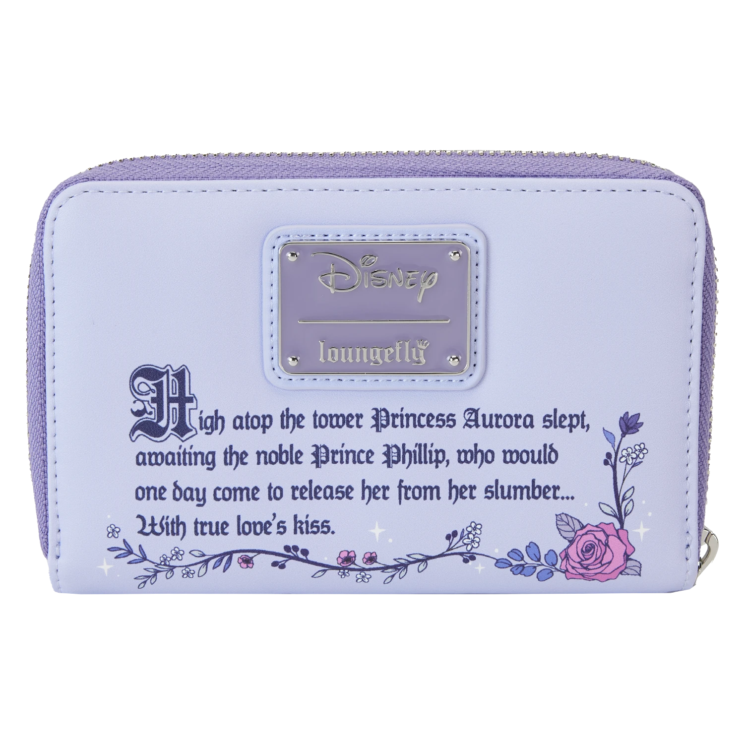 The Loungefly Sleeping Beauty 65th Anniversary Zip Around Wallet is made of vegan leather (polyurethane). Wallet zips closed and has shiny silver hardware. Additional features include embroidered and printed details. Take note of the coordinating 65th anniversary inside lining.