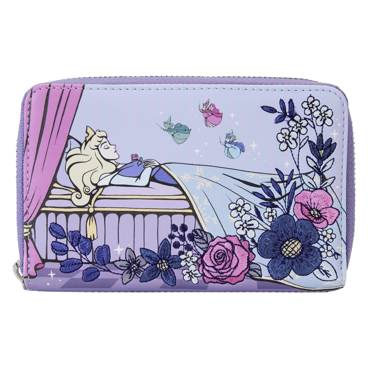 No need to prick your finger on a spinning wheel, this collection is a dream come true! Step into the timeless tale of this animated classic with the Loungefly Sleeping Beauty 65th Anniversary Zip Around Wallet. Embroidered flowers frame the front of this accessory, where Flora, Fauna, and Merryweather watch over Aurora as she sleeps. A quote from Auroraβs storybook appears on the back. Open the wallet to reveal five slots for holding cards and a clear slot for ID, which includes a die-cut window in the shape of Auroraβs crown. This accessory makes a spellbinding addition to any outing and is perfect for fans looking to keep their favorite characters close.