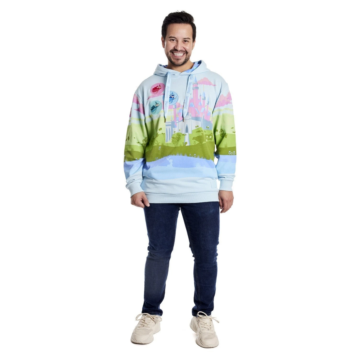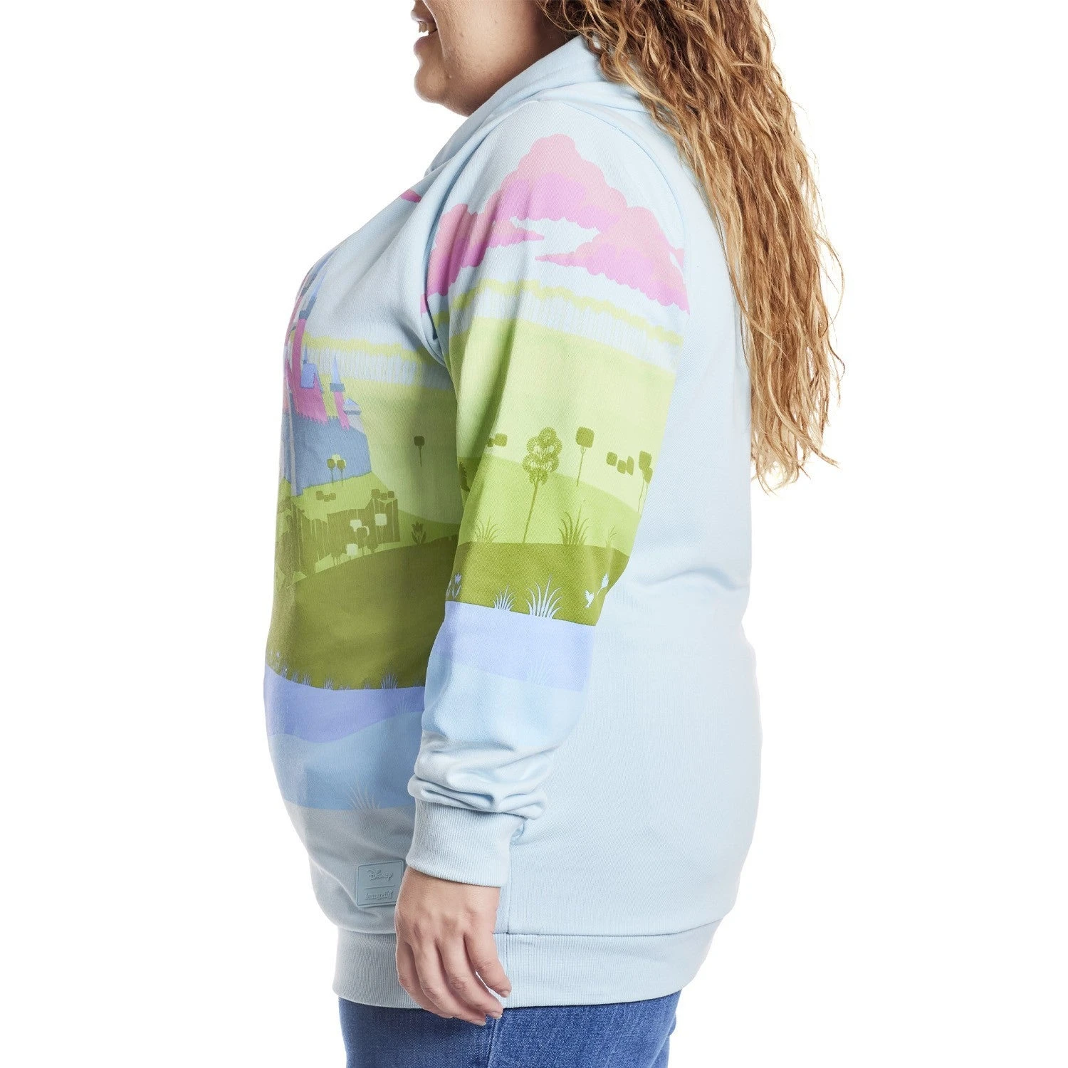 The Sleeping Beauty Castle Hoodie is made of French terry fabric (60% cotton, 40% polyester). Additional features include an extra-large, lanyard-style drawcord and a lined jersey hood. Comes in unisex sizes S through 3X. Sizing is very specific.