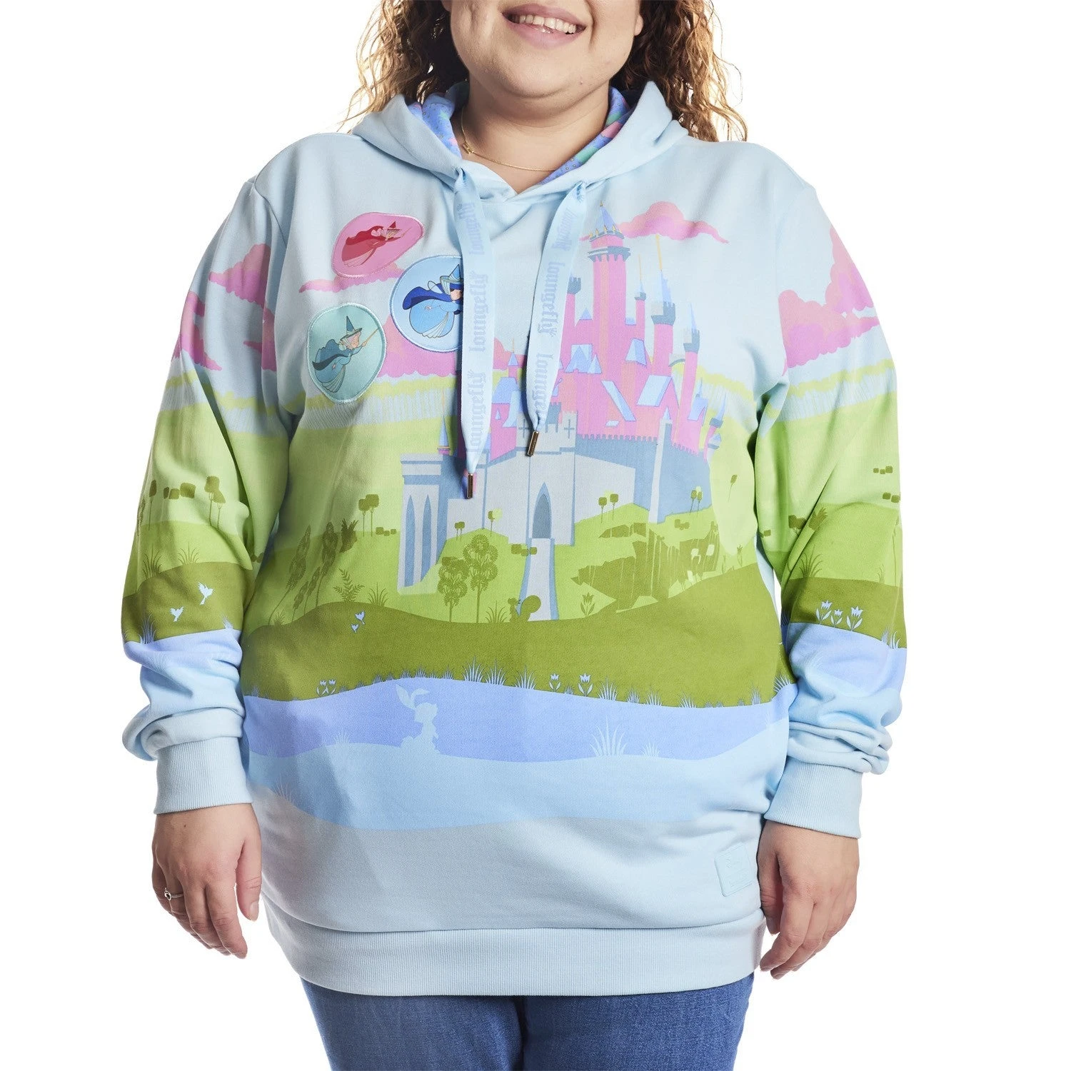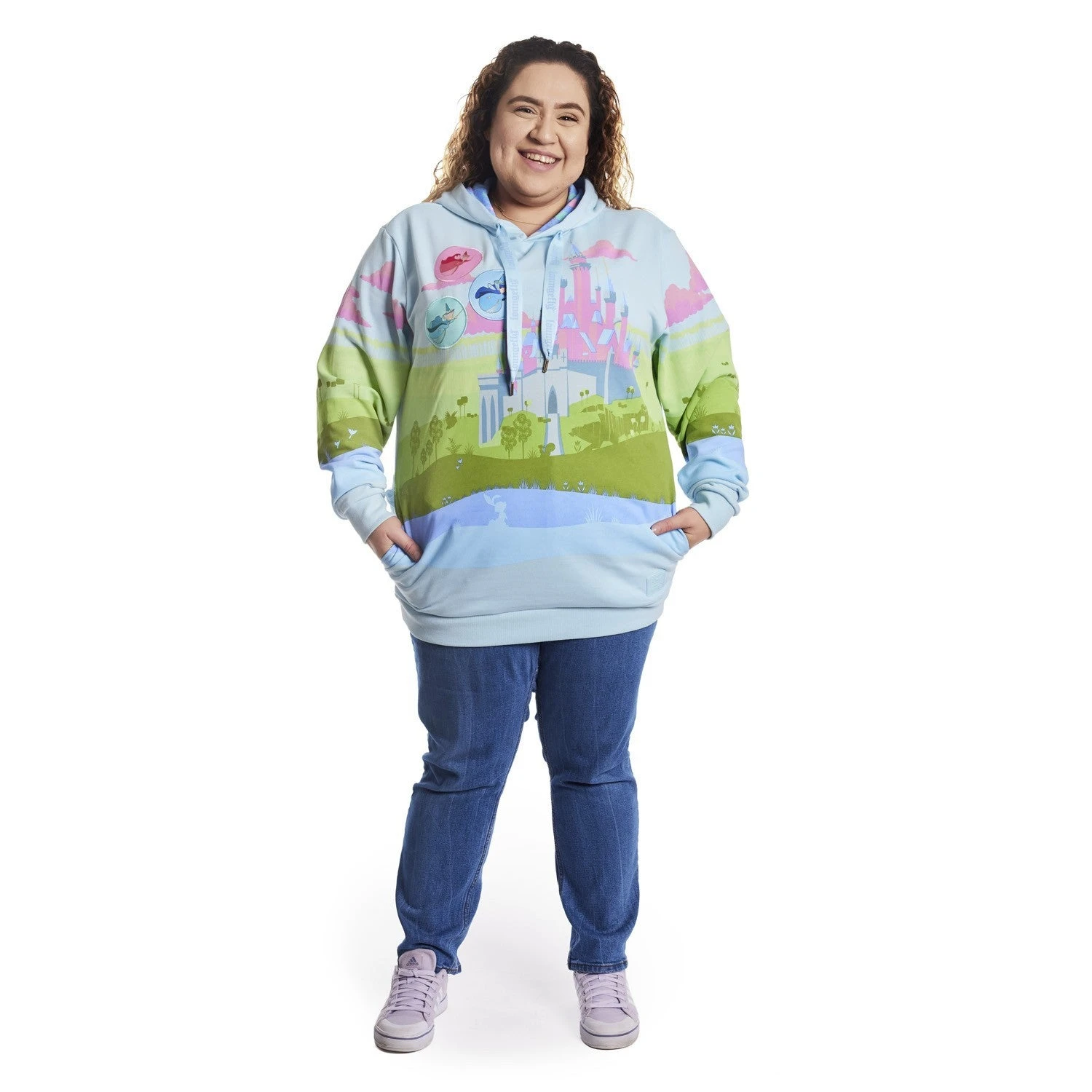 Hear ye! Hear ye! There’s a celebration throughout the land. Don our Sleeping Beauty Castle Hoodie to arrive in character. The Three Good Fairies are flying fast to the castle to await the news. Flora, Fauna, and Merryweather appear in satin “bubble” embroidered patches, soaring over the castle. Original art of the castle and surrounding landscape are beautifully screen printed onto the front and sleeves of this comfy hoodie. When the weather turns chilly, you can slip your hands inside cozy side pockets to keep them warm. Turn everyday moments into joyful occasions with this festive hoodie.