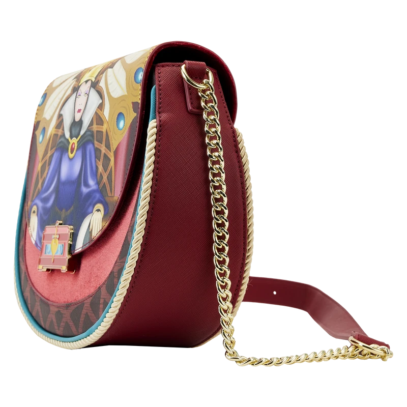 The Loungefly Disney Snow White Evil Queen Throne Crossbody Bag is made of vegan leather (polyurethane). Bag has an adjustable shoulder strap, sturdy gold-colored metal hardware, and features applique, gold-foil, velvet, and printed details. Take note of the coordinating pattern of the inside lining fabric.