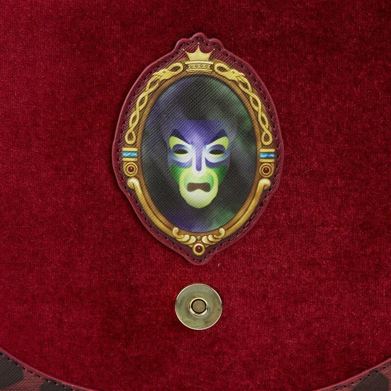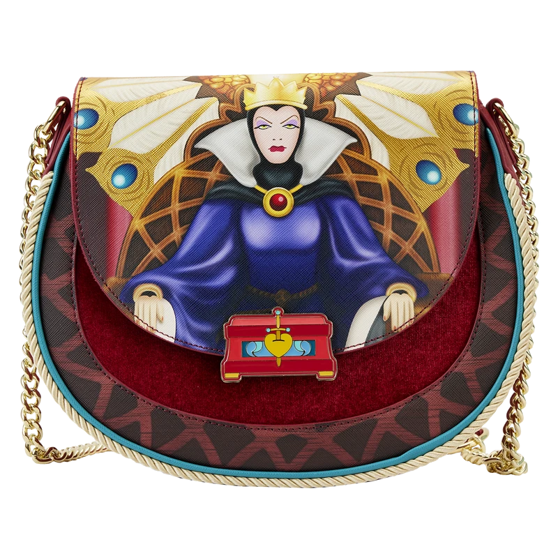 Elegantly evil and ready to rule! Bring on the reign with our Loungefly Disney Snow White Evil Queen Throne Crossbody Bag! The Evil Queen is looking particularly regal in the throne room. The front flap for this bag has applique and gold foil details of an elaborate peacock design that continue over the top of this stunning accessory. The Evil Queen, seated on her throne, holds the box meant to keep Snow White’s heart, and the clasp underneath serves as a closure to keep your valuables secure. When you open the flap, you’ll see the masked face in the Magic Mirror! Velvet details on the bag add a lush texture. Keep your favorite animated moments close while adding wickedly royal fun to your everyday outings, with this exquisite accessory.