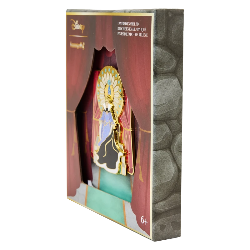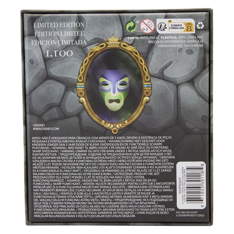 Elegantly evil and ready to rule! Bring on the reign with our Loungefly Disney Snow White Evil Queen Throne 3-Inch Collector Box Pin! The Evil Queen is looking particularly regal in the throne room. Layered elements bring all the details of this magnificent pin into view. Glitter sparkles on the Evil Queen’s dress. An elaborate circle of peacock plumes rises above her head, and red curtains billow in the background. It’s the perfect way to show off your fandom and add wickedly royal fun to your pin collection.