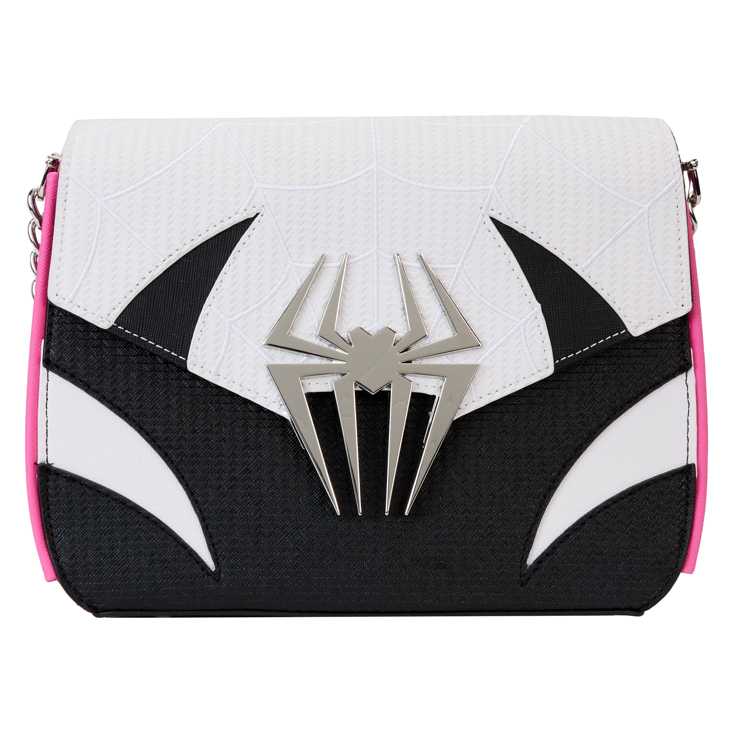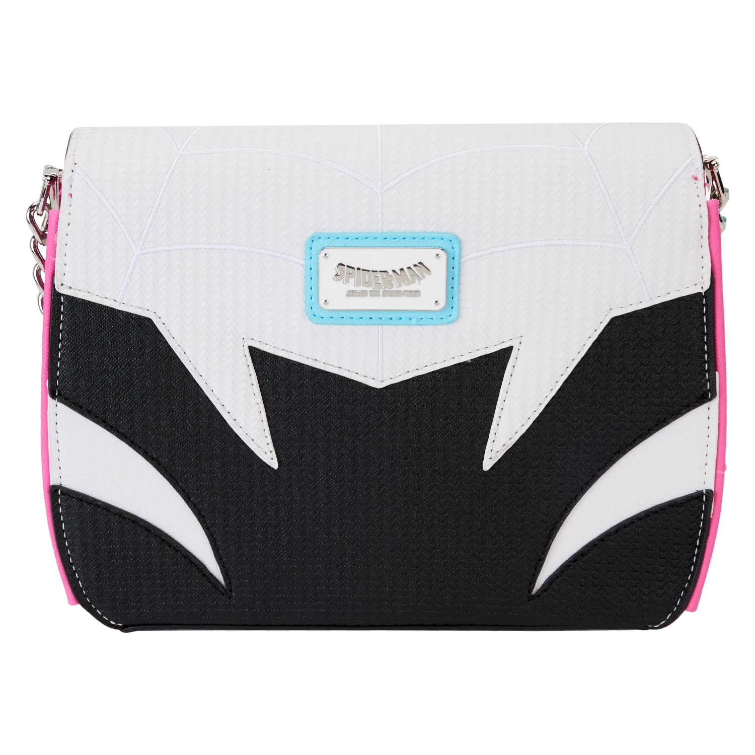 Let’s do this one more time! Bitten by a radioactive spider, Gwen Stacey takes the role of Spider-Gwen on the Loungefly Spider-Verse Spider-Gwen Crossbody Bag. On the front, a molded metal spider emblem secures the bag’s top flap. Striped details and spider webs recreate Gwen’s hero suit across the front and back of the design, while pink and blue webbing appears on the bag’s sides. This accessory makes a heroic addition to your next mission and will keep your belongings safe on your interdimensional travels.