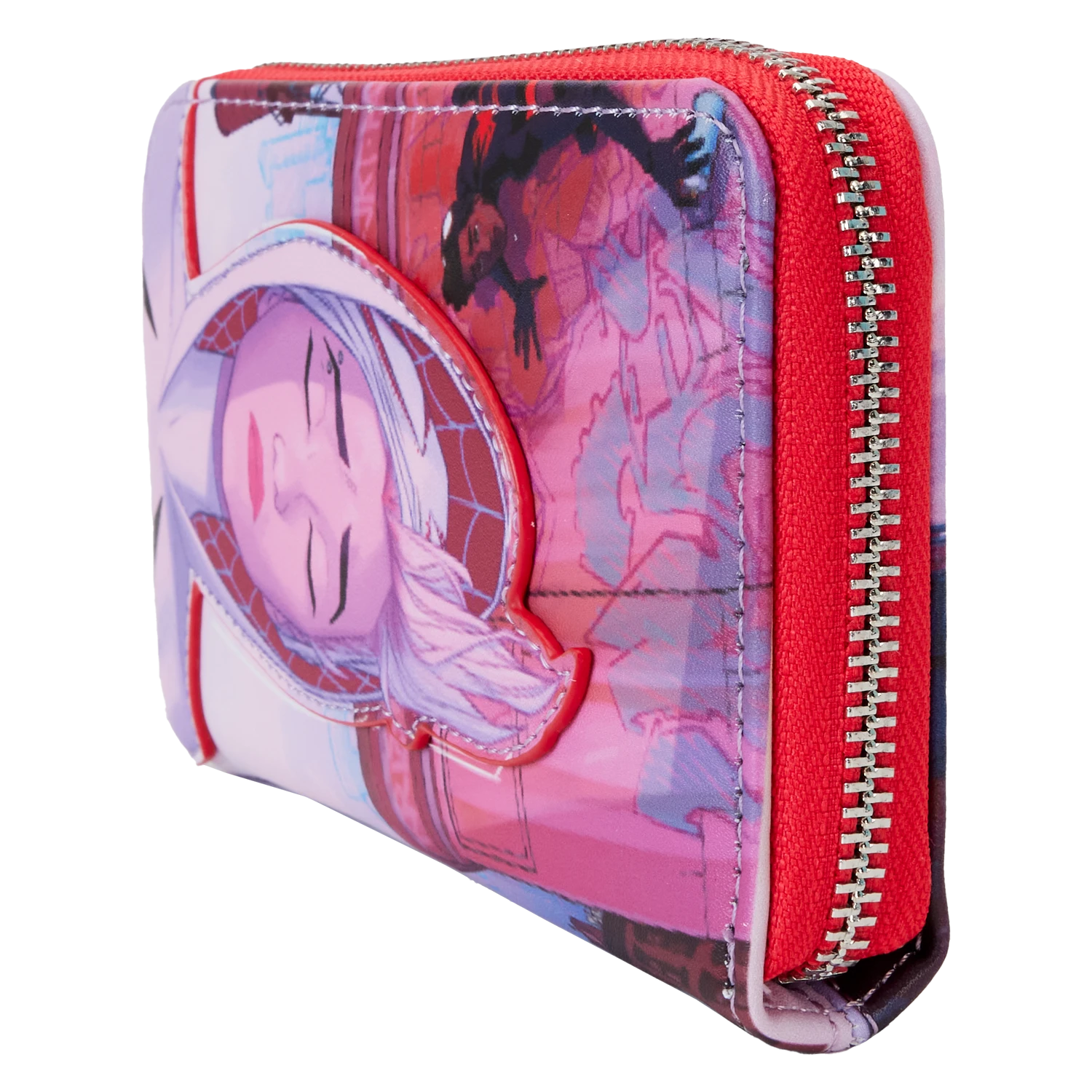 The Loungefly Spider-Verse Spider-Gwen Zip Around Wallet is made of vegan leather (polyurethane). Wallet zips closed with shiny silver hardware. Additional features include applique and printed details. Take note of the portal-shaped ID window and the coordinating inside lining.