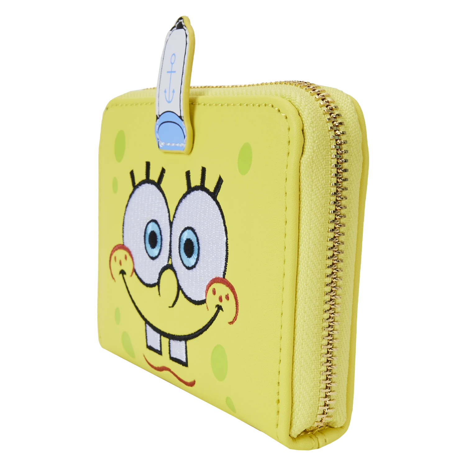 The Loungefly SpongeBob 25th Anniversary Zip Around Wallet is made of vegan leather (polyurethane). Wallet zips closed with shiny gold hardware. Additional features include applique, debossed, embroidered, and printed details. Take note of the coordinating inside lining.