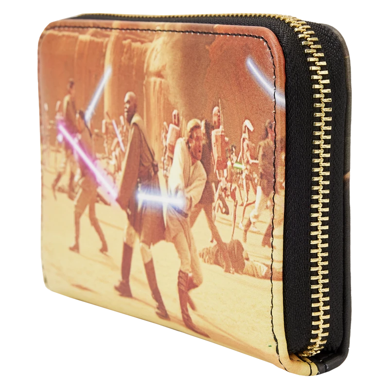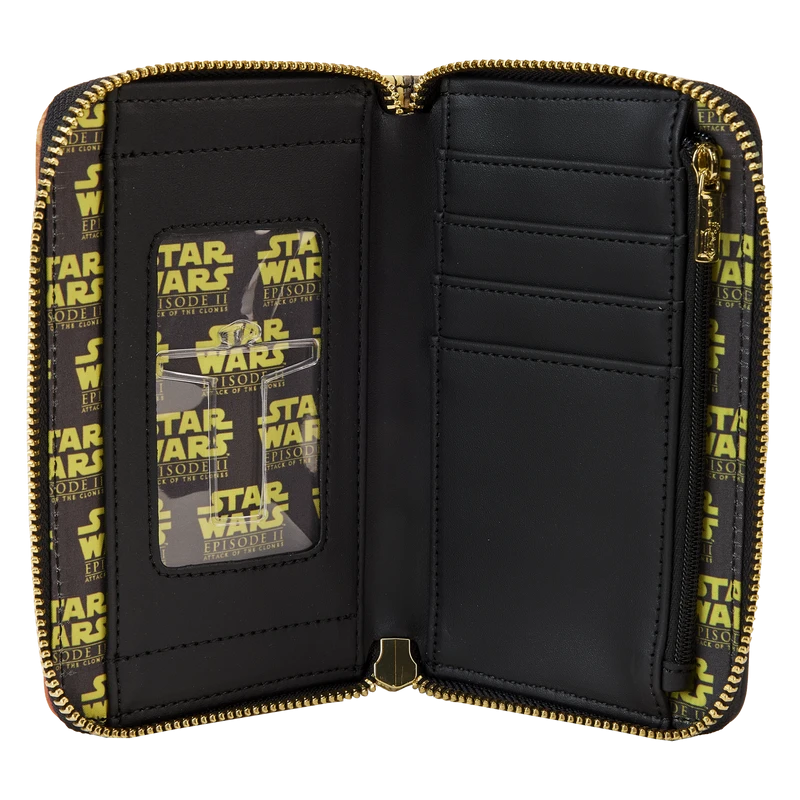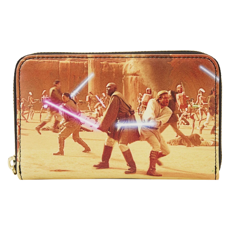 The Loungefly Star Wars: Episode II – Attack of the Clones Scene Zip Around Wallet is made of vegan leather (polyurethane). Wallet zips closed with sturdy metal hardware and features printed details. Take note of the coordinating inside lining.