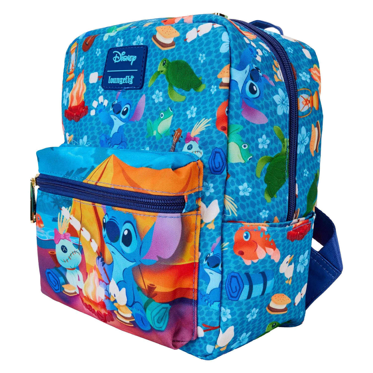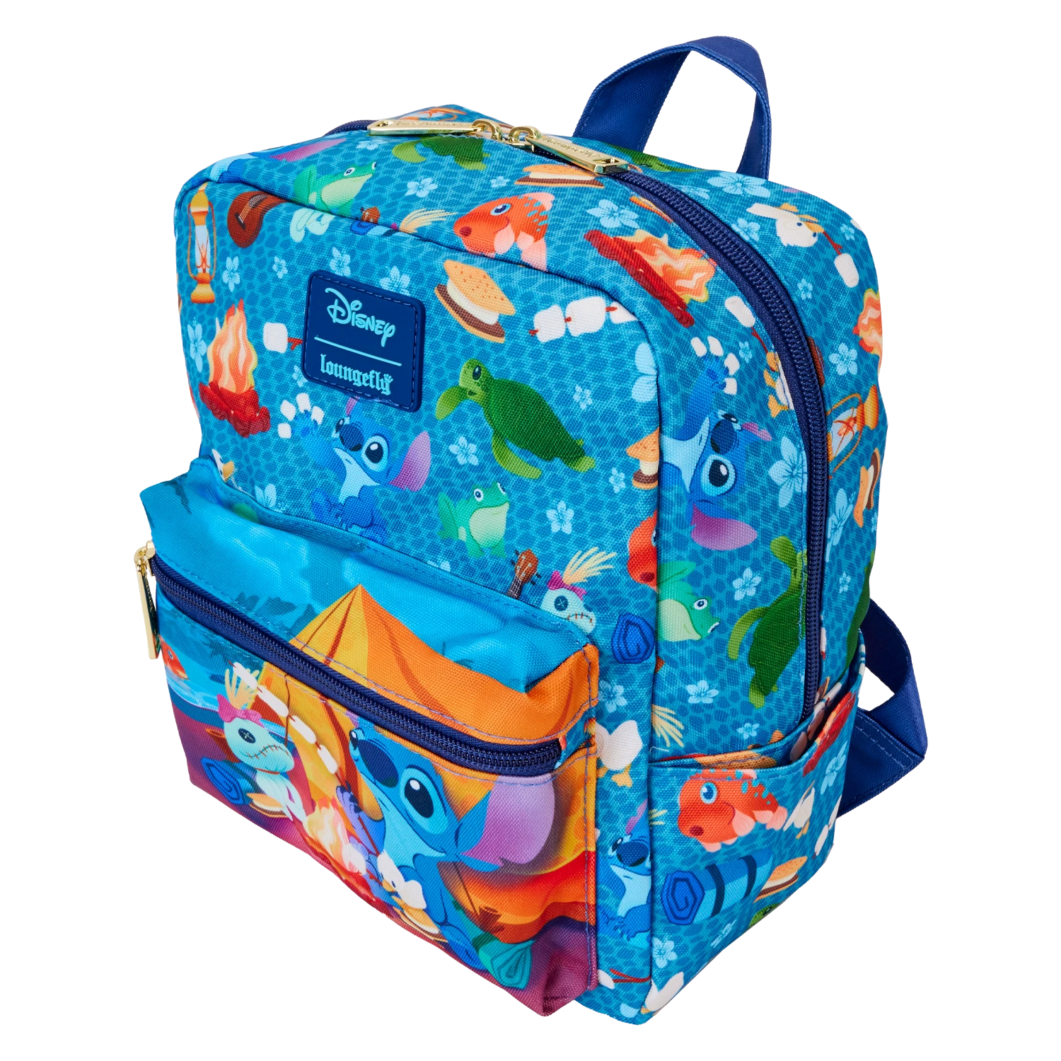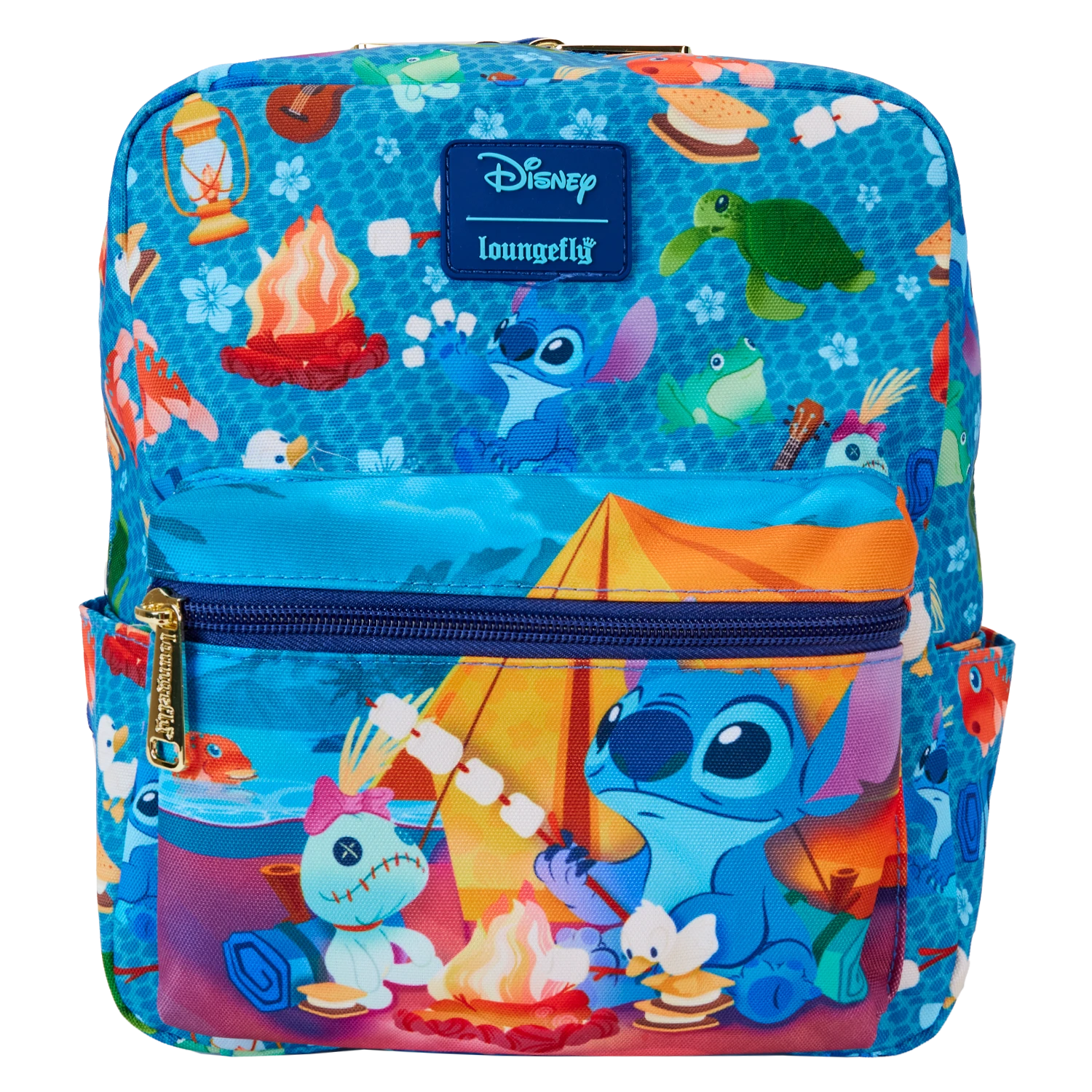 The Loungefly Stitch Camping Cuties AOP Nylon Mini Backpack features printed details. Bag has adjustable shoulder straps and shiny gold hardware. Take note of the coordinating inside lining.