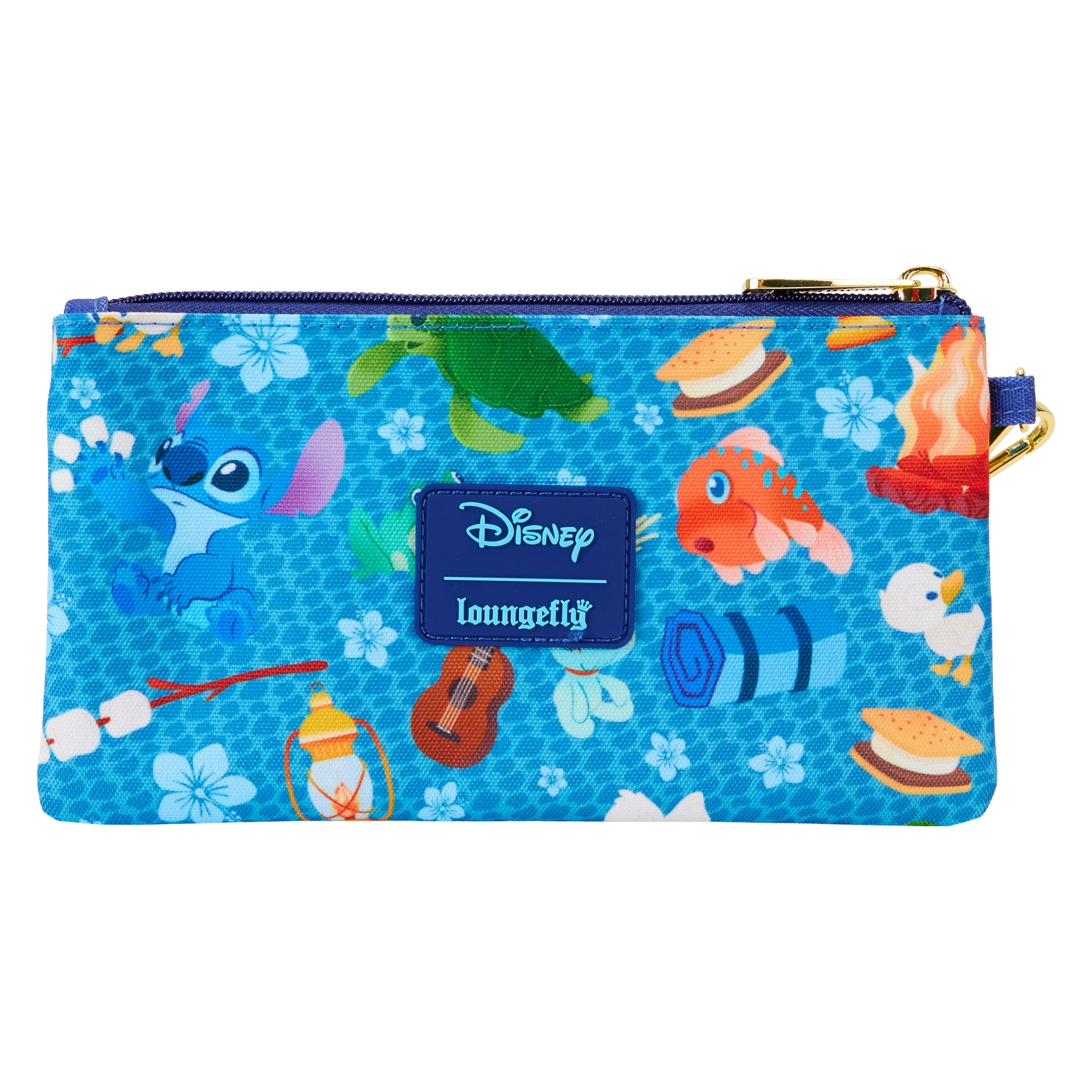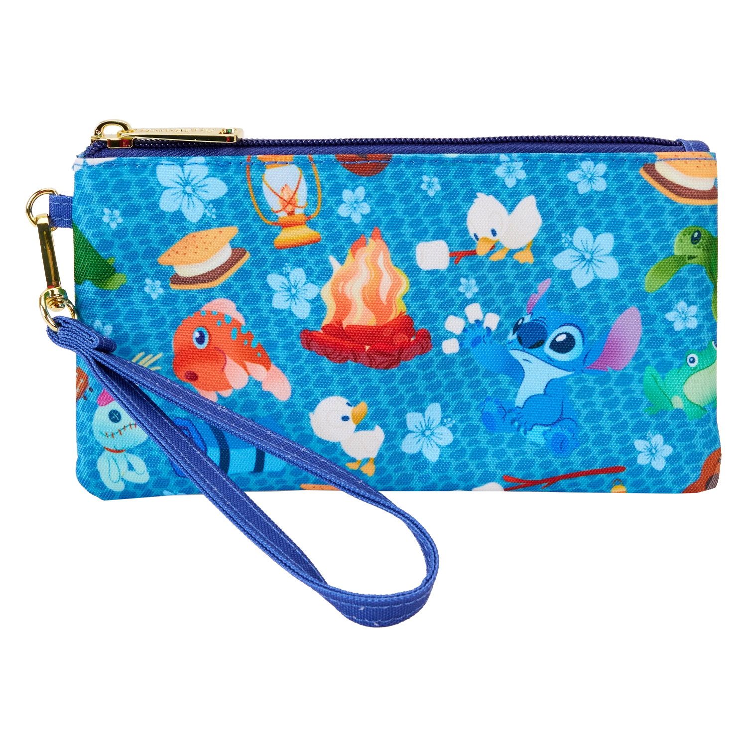 The Loungefly Stitch Camping Cuties AOP Nylon Wristlet features shiny gold hardware, detachable wrist strap, and printed details. Inside features three slots for holding cards and important items. Take note of the coordinating inside lining.