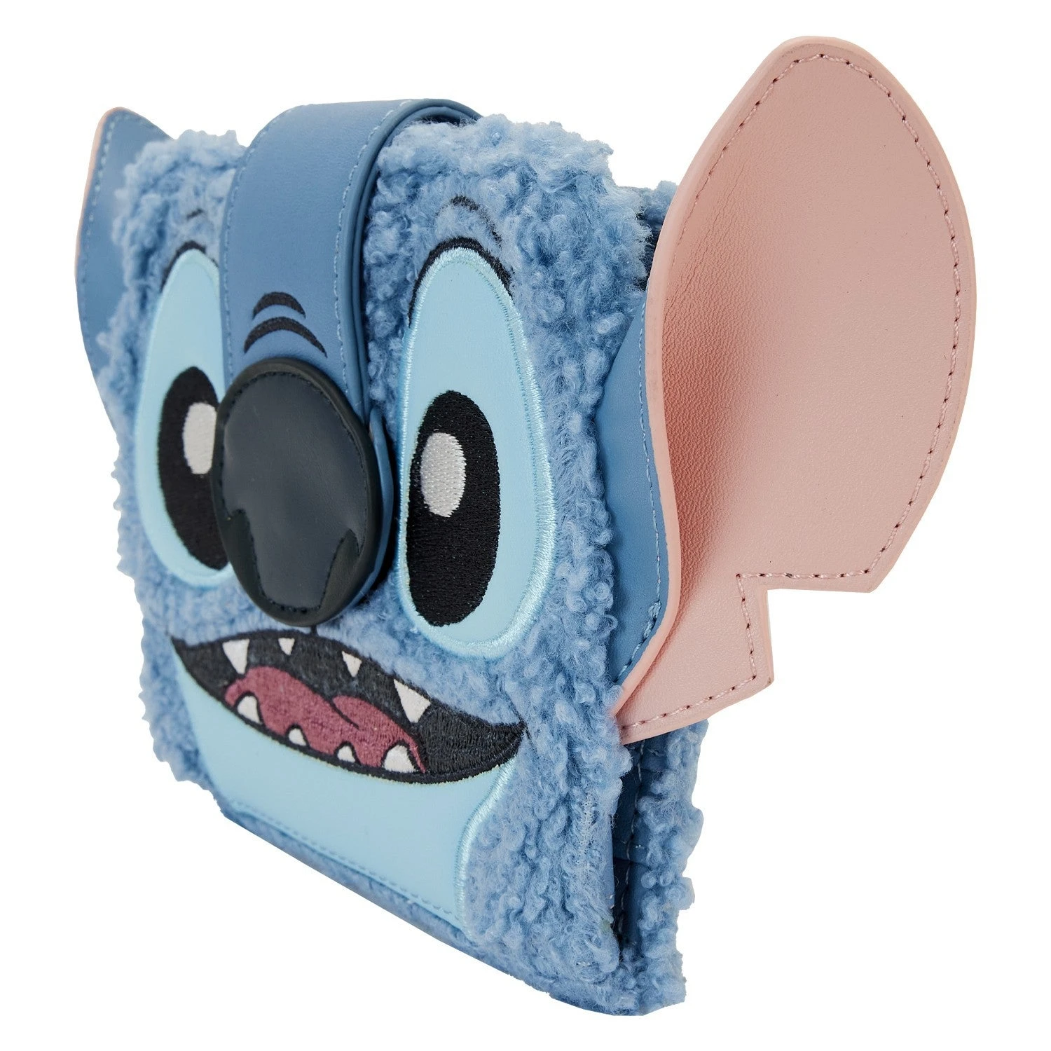 The Stitch Plush Bifold Wallet is made of vegan leather (polyurethane) with sherpa material. Wallet snaps closed with silver-colored metal hardware. Additional features include applique, embroidered, and printed details. Take note of the coordinating inside lining.