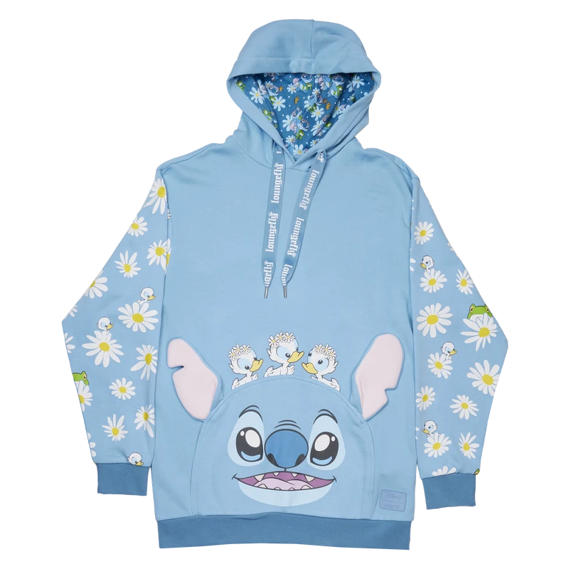 New beginnings are in bloom! Embrace a season of fresh starts with the Lilo & Stitch Springtime Stitch Unisex Hoodie. On the front, Stitch takes shape on the hoodie’s pocket with figural details and applique ears that bring him to life. Up above, a group of ducklings wear flower crowns as they perch atop Stitch’s head. Look closely and you’ll find the ducklings and a frog hidden in the field of daisies covering each sleeve! Oversized lanyard-style drawcords cinch together the hood, which is lined in an all-over print of Stitch and his friends. This cute and cozy hoodie makes an adorable addition to any outfit and will keep you looking stylish on your next outing.