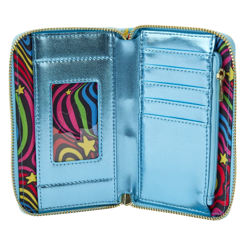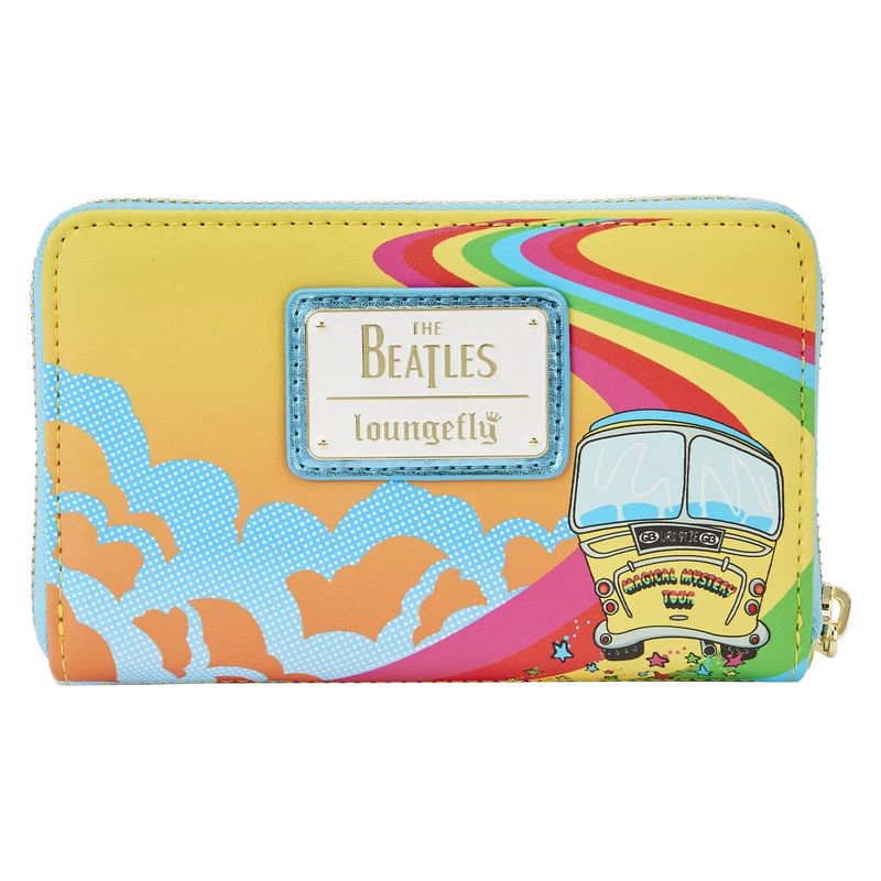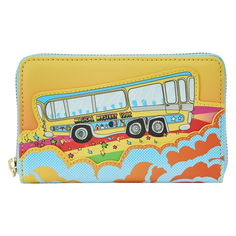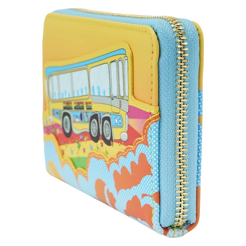 The Loungefly The Beatles Magical Mystery Tour Bus Zip Around Wallet is made of vegan leather (polyurethane). Wallet zips closed with shiny gold hardware. Additional features include applique and printed details. Take note of the coordinating inside lining.