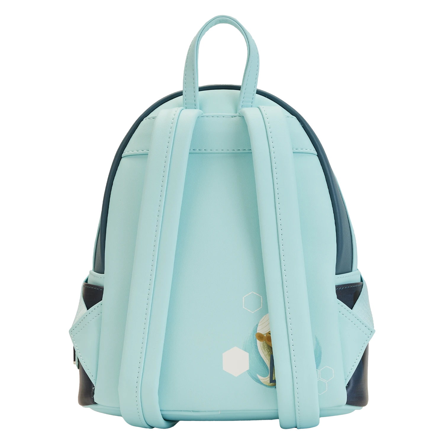 Backpack features include sturdy silver-colored metal hardware, adjustable straps, vegan leather (polyurethane), side pockets, and applique and glow-in-the-dark details. Note the coordinating lining.