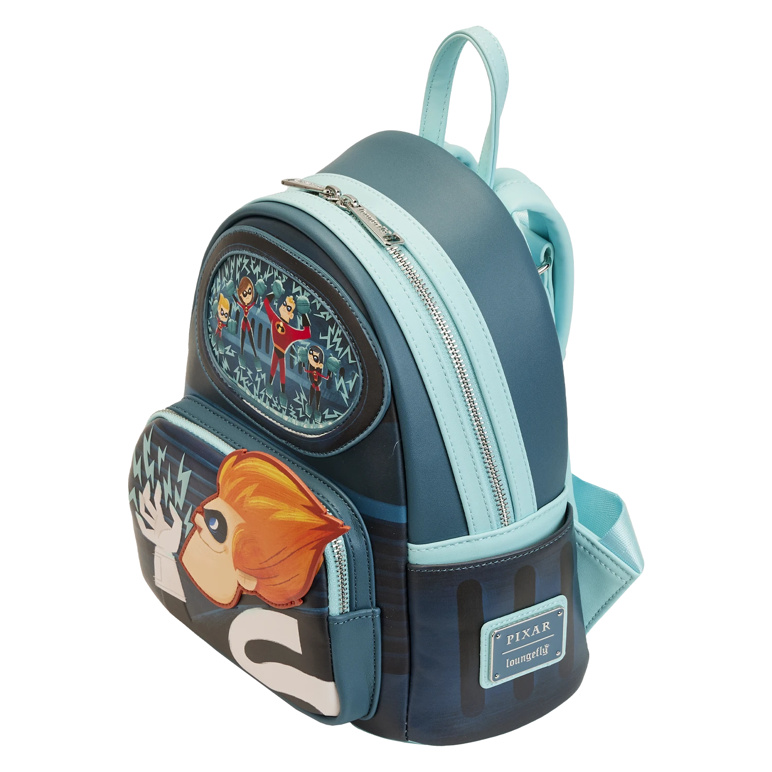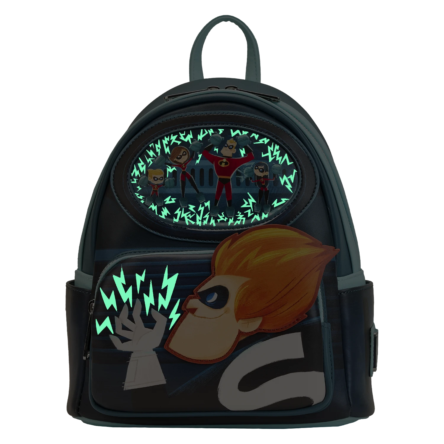 Zap through your day in incredible style with our Loungefly Disney-Pixar Moments Incredibles Syndrome Mini Backpack. Syndrome has trapped the Incredibles family, so he can carry out his evil plans. This mini backpack captures this moment in applique and glow-in-the-dark details. The sparks from Syndrome’s fingers, and surrounding the Incredibles family, come to life in the dark. Details from Syndrome’s lair continue on the side pockets, and on the back, you’ll find Mirage. It’s the perfect accessory for making an incredibly illuminating escape—or for turning everyday outings into heroic adventures.