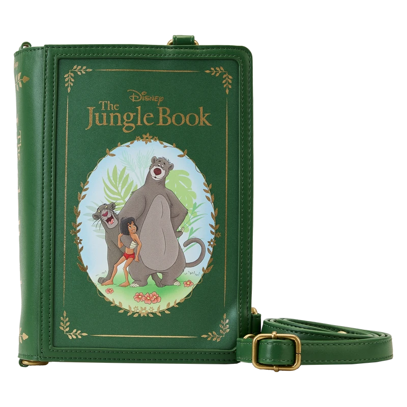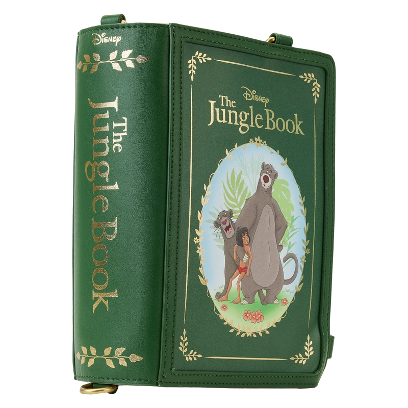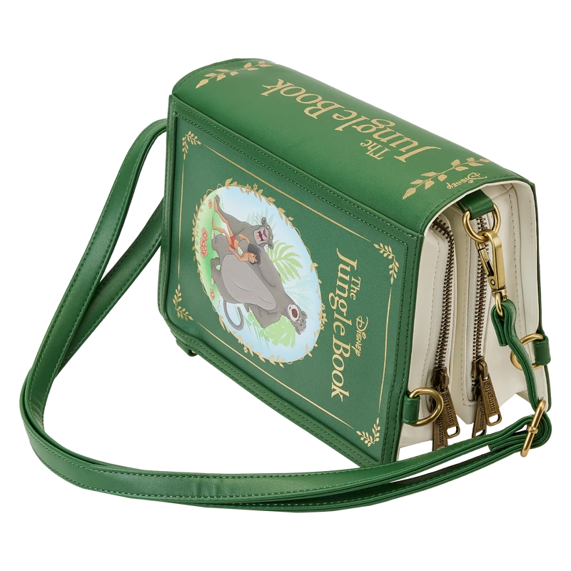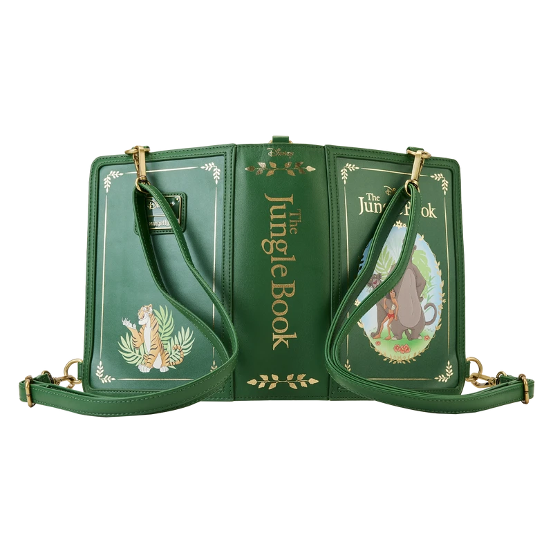 Another adventure for the books! Carry our Loungefly Disney The Jungle Book Convertible Crossbody Bag and let the fun begin. This beautiful interpretation of a Disney classic book features a “front cover” with gold foil lettering on the front and down the “spine.” Cherished characters gather in the jungle, including Mowgli, Baloo, and Bagheera. On the back, Shere Khan shows off his claws. Inside, hand-drawn, original illustrations bring characters and scenes to life. These characters include King Louie; Mowgli; Bagheera; Kaa; Raksha, Rama, and their cubs; Hathi Jr., Shere Khan; Baloo, and more. Not only do they appear on the “pages” when the book is opened but also down the middle. Easily convertible, this bag can transform into a backpack with the book lying open against your back or can be worn closed as a crossbody purse. With secure zipper pockets disguised as book pages, this multi-function bag is the perfect accessory for all the wondrous outings you’ve bookmarked.