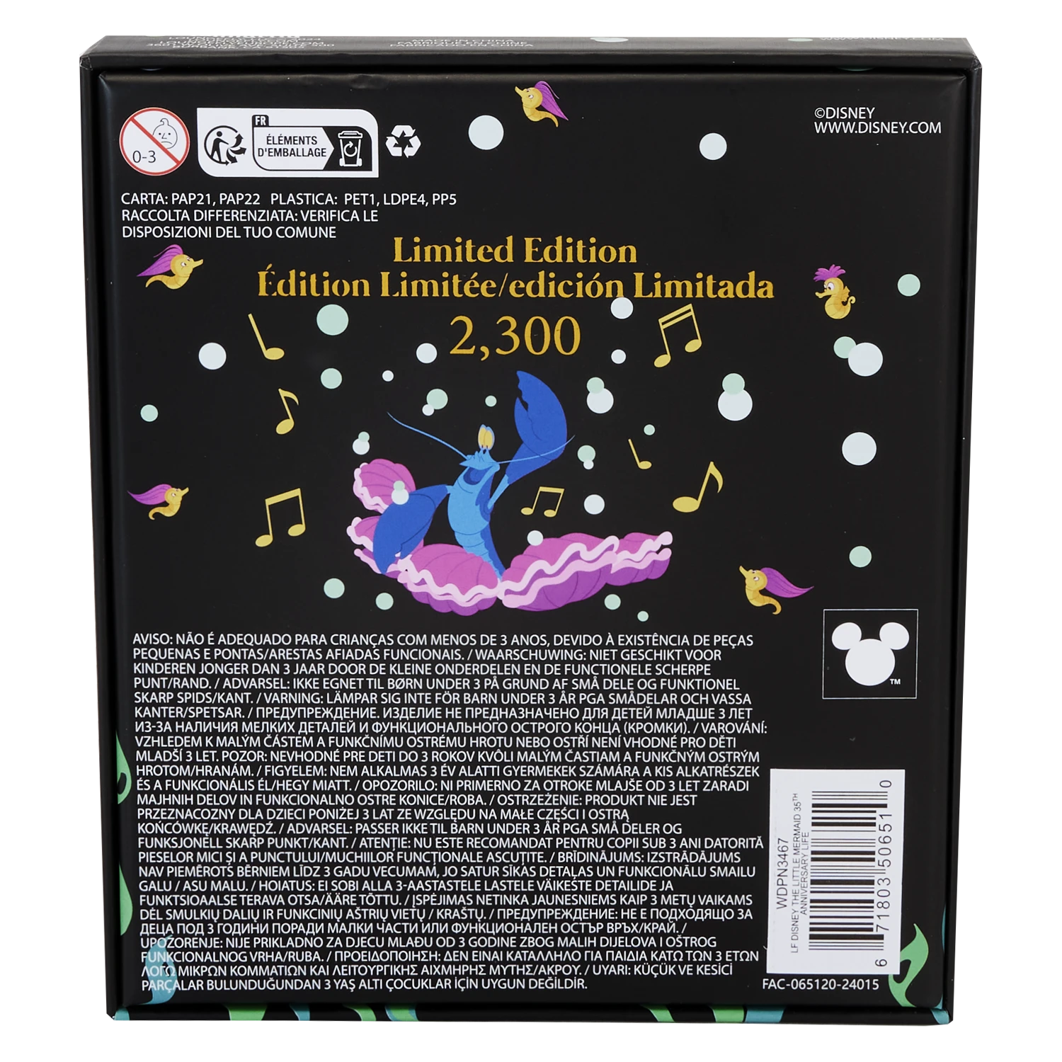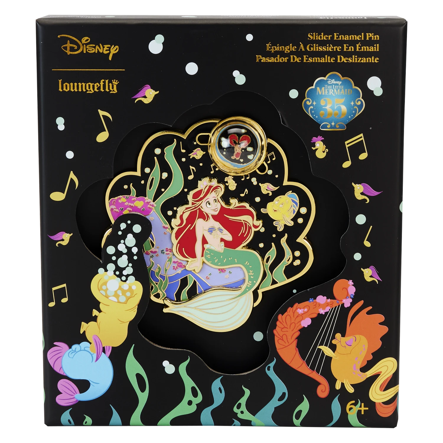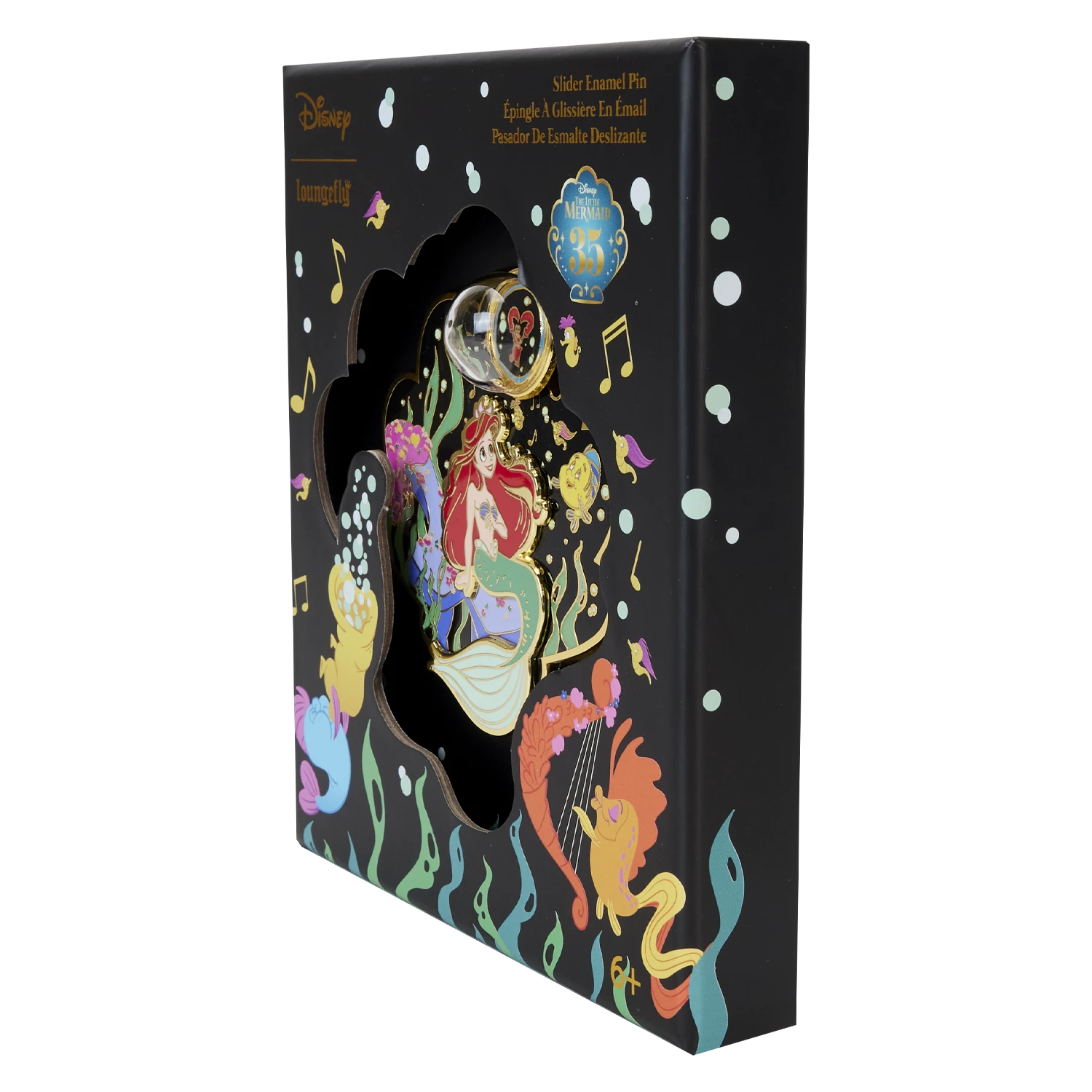 Pull up a shell for a front-row, underwater concert view! Our Loungefly The Little Mermaid 35th Anniversary “Life is the Bubbles” 3-inch Collector Box Pin makes the perfect treasure for your collection. This clamshell-shaped, layered enamel pin features Ariel, seated upon a rock underwater, surrounded by colorful plants, her hair flowing. Flounder is there, along with delightful seahorses and musical notes and bubbles that rise up all around. Sebastian appears in a clear domed bubble that slides on a moving mechanism over the other characters’ heads. Swim away with something fun to celebrate The Little Mermaid’s 35th anniversary.