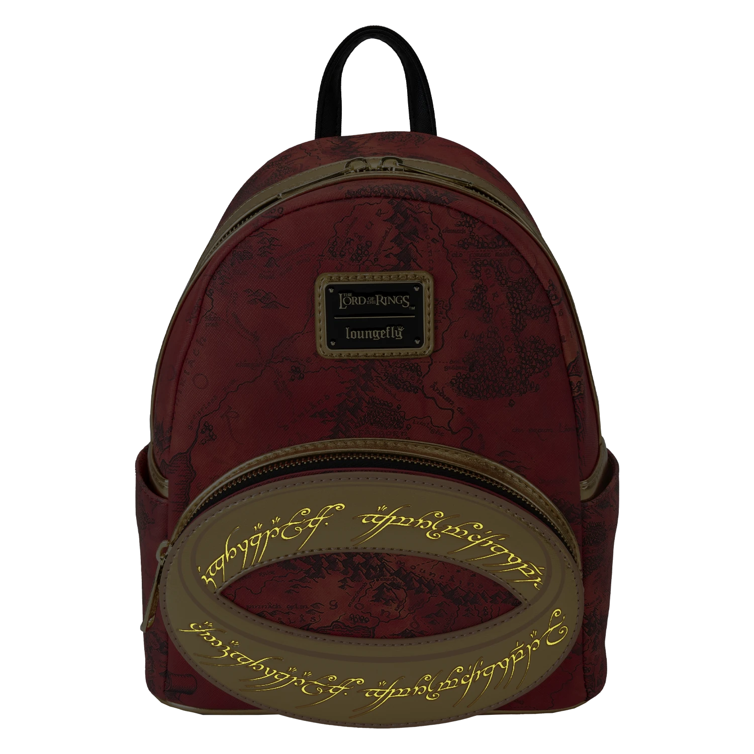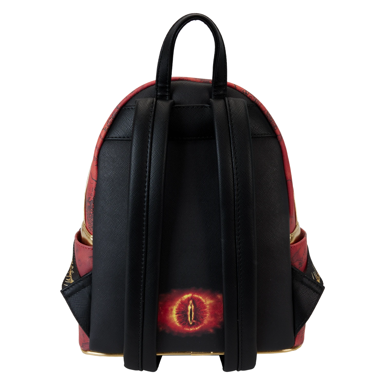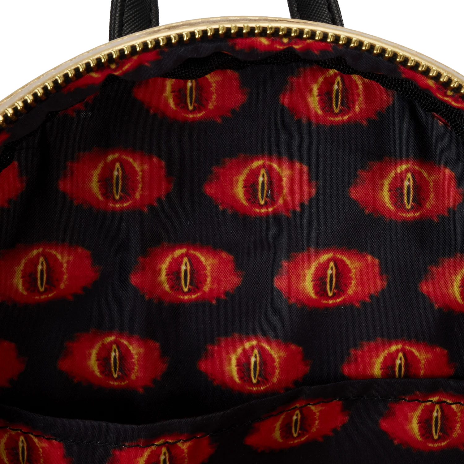 The Loungefly Lord of the Rings The One Ring Mini Backpack is made of vegan leather (polyurethane). Bag has adjustable shoulder straps and shiny gold hardware. Additional features include applique, debossed, glow-in-the-dark, metallic, and printed details. Take note of the coordinating inside lining.