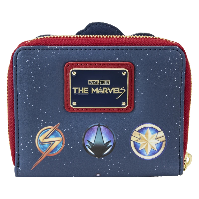 Gear up for an adventure of cosmic proportions! The Marvels Group Zip Around Wallet brings together three stellar super heroes. On the front, Captain Marvel, Photon, and Ms. Marvel stand together in a Loungefly exclusive art style. Below, a star-shaped symbol appears against a starry background. Turn down the lights to activate the design’s glow-in-the-dark details! On the back, symbols from the three heroes appear in a debossed print. With four slots for holding cards and a clear slot to hold ID, this wallet will keep your belongings safe on any mission. The Marvels Group Zip Around Wallet is made of vegan leather (polyurethane). Wallet zips closed with sturdy metal hardware. Additional features include applique, debossed, glow-in-the-dark, and printed details. Take note of the coordinating inside fabric.