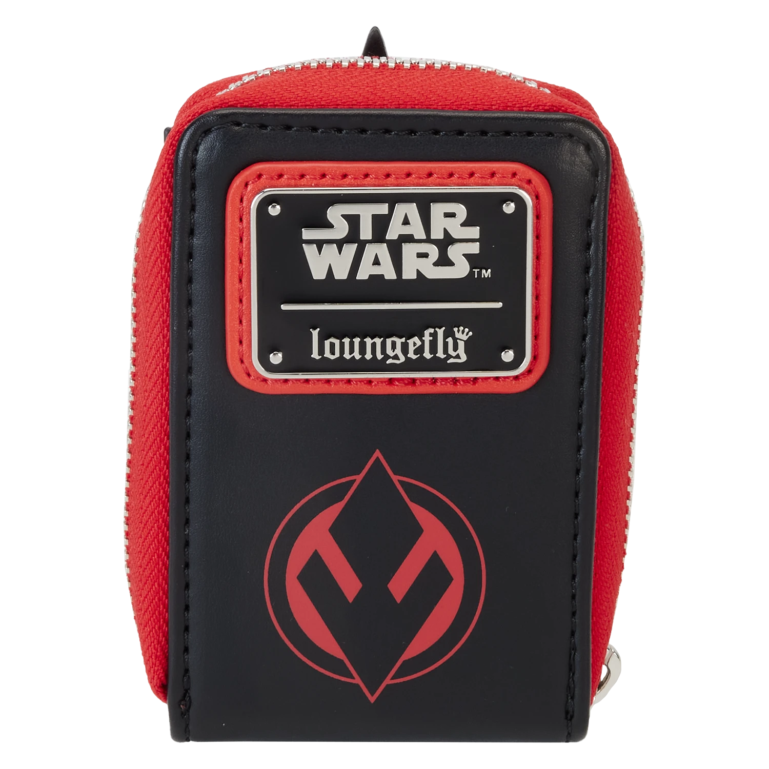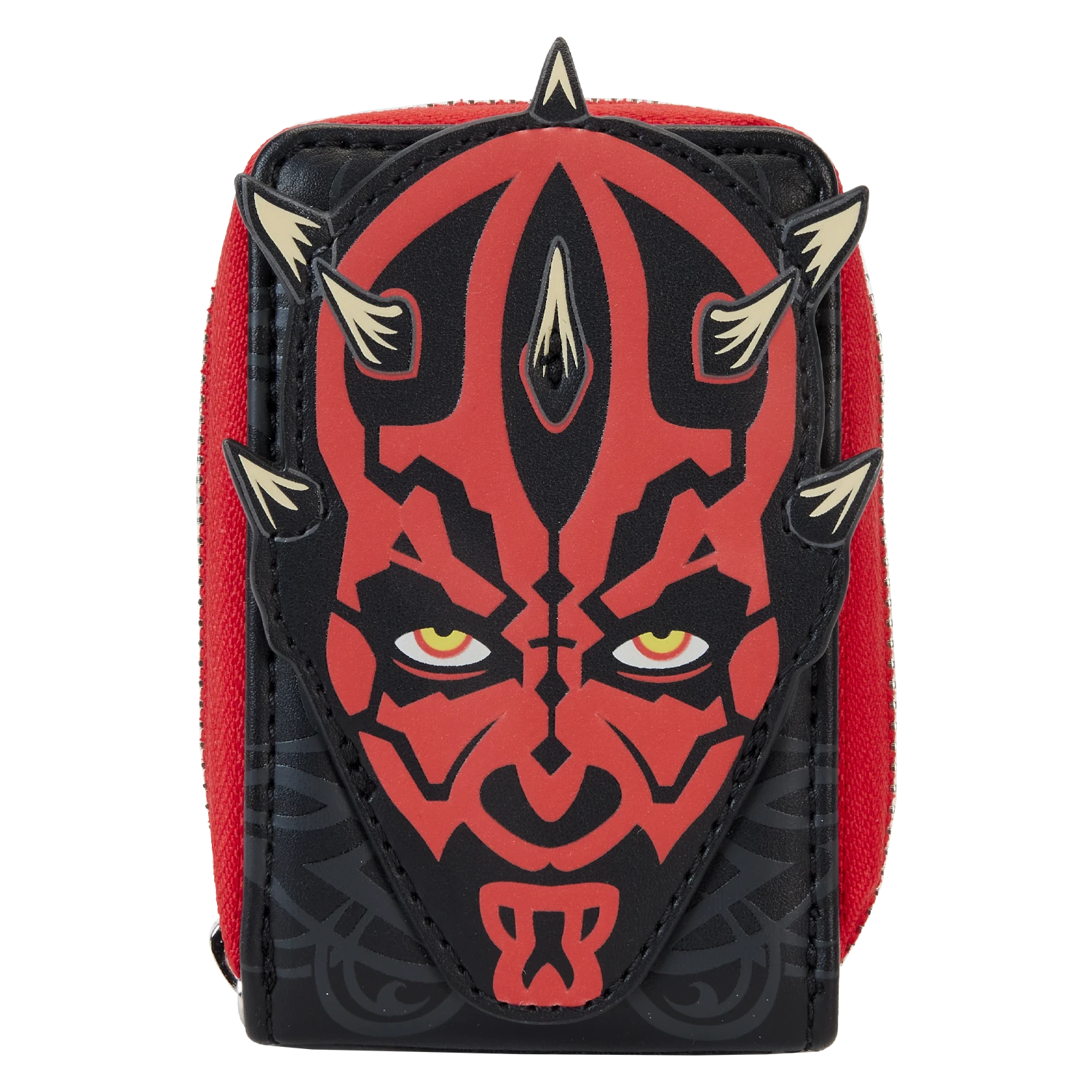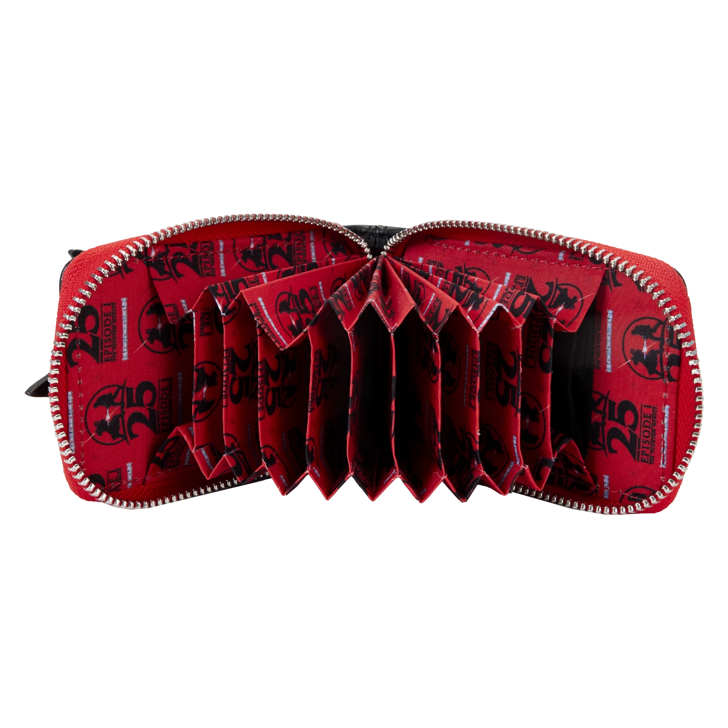 The Loungefly Phantom Menace 25th Anniversary Darth Maul Accordion Wallet is made of vegan leather (polyurethane). Wallet zips closed with shiny silver hardware and includes plenty of pockets for holding cards. Additional features include applique, debossed, glow-in-the-dark, and printed details. Take note of the coordinating inside lining.