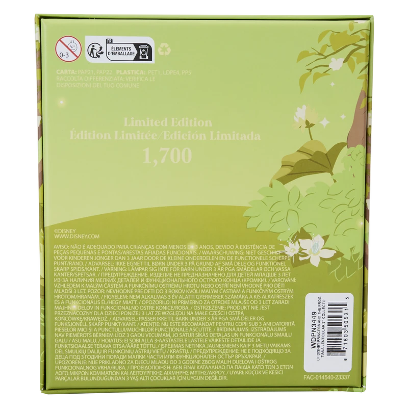 With a little wish and some hard work, your dreams are sure to come true! The Princess and the Frog Tiana Lenticular 3” Collector Box Pin recreates Disney’s inspiring animated tale. On the front, Tiana stands in a frame of lilies as she looks back on scenes from her story. Look closely and you’ll see motifs from Tiana’s memories hidden in the frame! Lenticular details appear behind her, shifting between images of Tiana and Naveen’s wedding and of Tiana reading a storybook. This pin makes a shining addition to any outfit or bag and is perfect for fans looking to keep some of their favorite characters close.