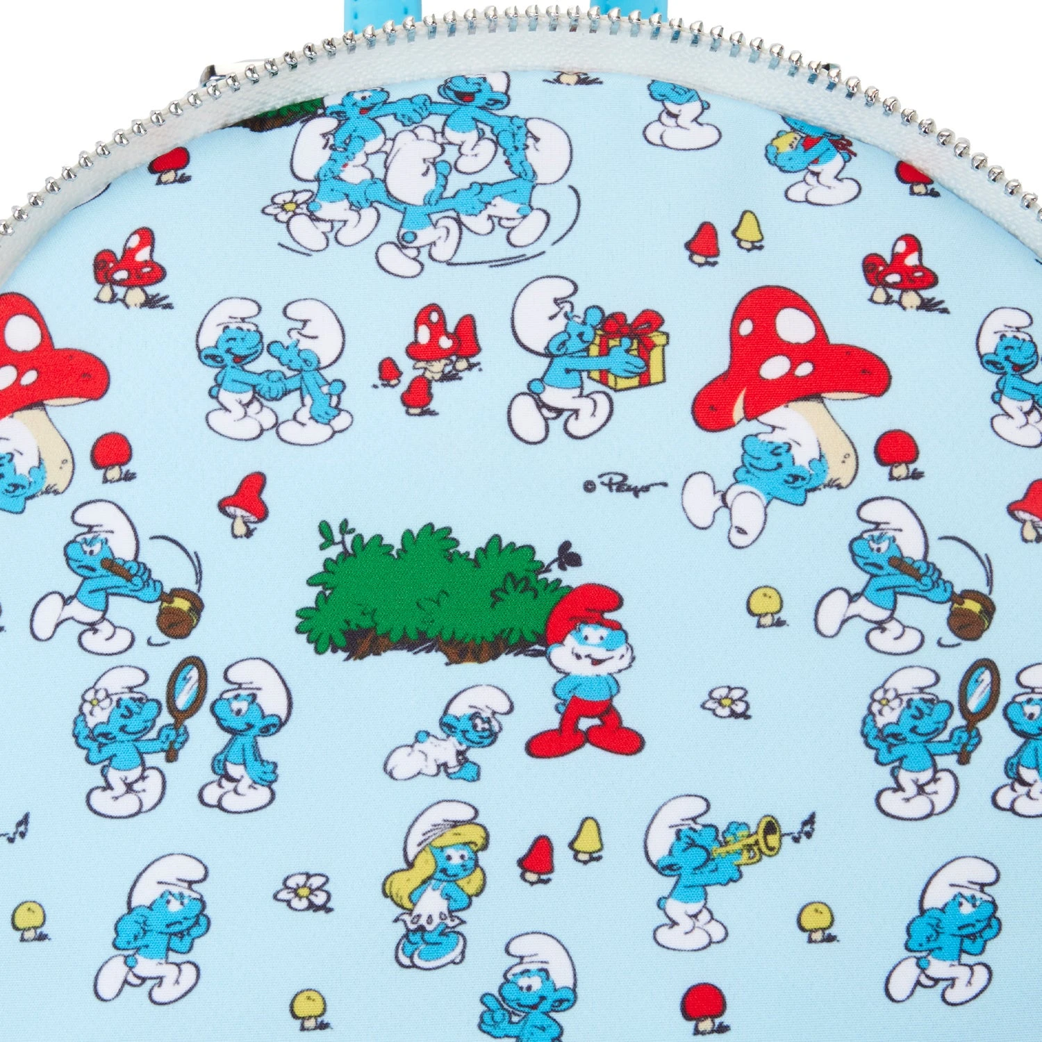 La-la-la-la-la-la! Have a wonderfully Smurfy day with our The Smurfs Smurfette Cosplay Mini Backpack. This blue backpack features Smurfette’s adorable face and hat on the front, in die-cut applique detail. Her skirt takes on a fun scalloped design at the hem. Behind her, you’ll find a front zipped compartment for storing smaller items on all your journeys. A white and yellow daisy debossed print pattern follows along the top, and on the side pockets, you’ll find printed images of the colorful mushrooms. Turn the backpack around, and you’ll discover the entire cast, including Papa Smurf and Smurfette, front and center. Make your way through the Smurf Village in style with this fun accessory.