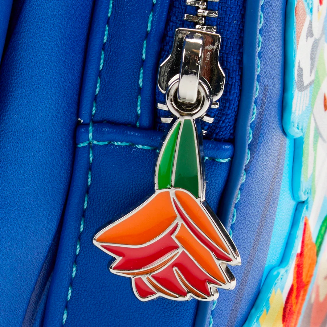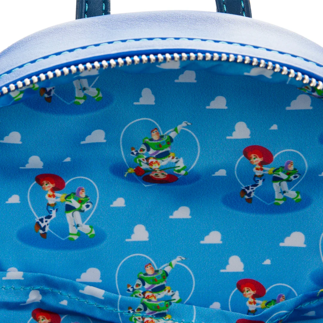 Clear the dance floor and shine a spotlight on Buzz Lightyear and Jessie as they spin and shake their hips to a Flamenco beat! Capture this upbeat moment and keep it close with the Loungefly Disney-Pixar Toy Story Jessie and Buzz Mini Backpack. On the front zipped compartment of this backpack, Buzz dips Jessie who, with dramatic flair, looks up, holding a rose between her teeth. An enamel-fill charm of a rose, over the zipped compartment, completes the scene. Above them, two Toy Story Aliens perch on a boombox while Bullseye looks down over the scene. On one of the side pockets, a printed detail of Woody appears with a rose. On the back, Buzz and Jessie continue to dance, center stage, while Mr. Potato Head, Mrs. Potato Head, the Peas-in-a-Pod, and Dolly form a circle around them. This backpack is the perfect accessory to complement a Disney outfit or turn any outing into a magical adventure.