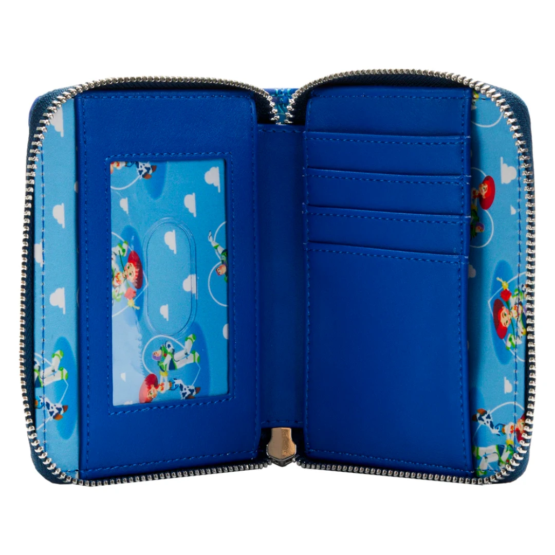 The Loungefly Toy Story Jessie and Buzz Lightyear Zip Around Wallet is made of vegan leather (polyurethane). Wallet zips closed, has sturdy silver-colored metal hardware, and features printed and embroidered details. Take note of the coordinating pattern of the inside lining fabric.