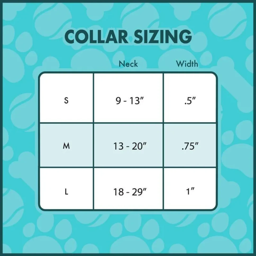 Collar dimensions: (Small) 0.5”W, Neck: 9”-13”; (Medium) 0.75”W, Neck: 13”-20”; (Large) 1”W, Neck: 18”-29”