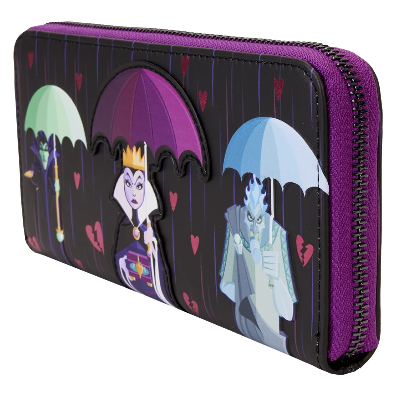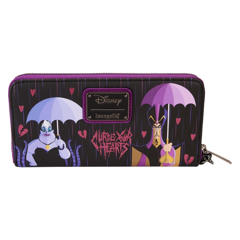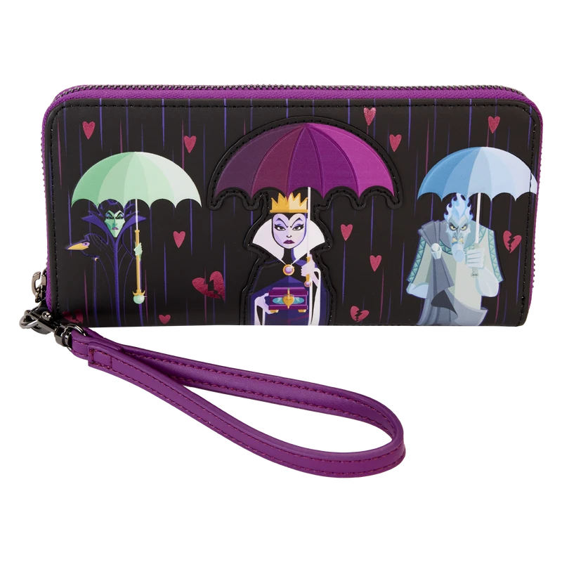 Hearts will ache when you pass by with this Villains Curse Your Hearts Zip-Around Wristlet Wallet. On the front, a die-cut shape of Evil Queen appears. She looks unamused as she holds her heart box. In her other hand, she carries an umbrella as torrential rain falls, along with foil broken hearts. Next to her, Hades and Maleficent hold their own umbrellas, and they look just as unhappy as the Evil Queen. On the back, the rain and broken hearts continue to fall, and Ursula and Jafar stand side by side with their respective umbrellas. The words “Curse Your Hearts” appear above them in stylized letters. Inside this wallet, you’ll find approximately seven slots for holding cards and one clear slot for displaying your ID. A die-cut shape of a broken heart, on the clear ID slot, adds a signature touch. Take off on journeys of whatever your dark heart desires with this wonderfully wicked accessory.