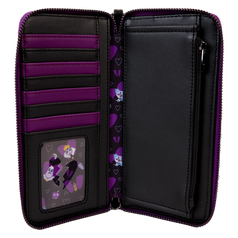 The Villains Curse Your Hearts Zip-Around Wallet Wristlet is made of vegan leather (polyurethane). Wallet zips closed with gunmetal-colored hardware. Additional features include applique, debossed, embroidered, foil, and printed details. Take note of the coordinating inside lining.